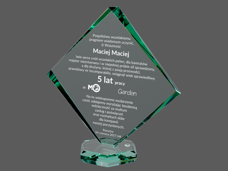 Statuetka szklana G022 z grubego szkła w kształcie szlifowanego rombu z grawerem dedykacji, loga lub grafik z podziękowaniem za staż pracy.