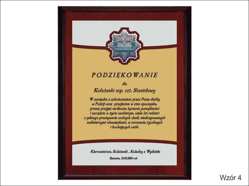 Prezentowany dyplom dedykowany jest jako pamiątka na zakończenie służby czy pożegnanie z pracy, ale można wykonać go też na inną okoliczność.