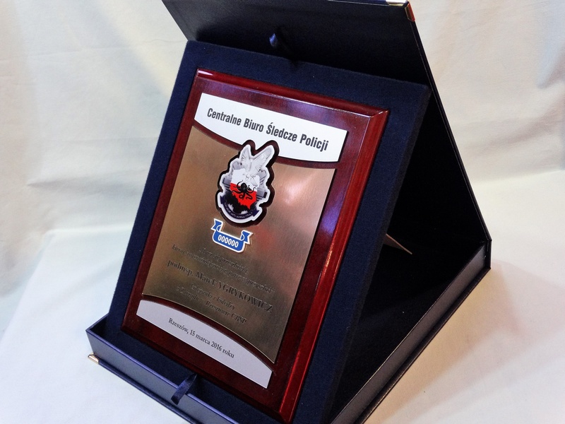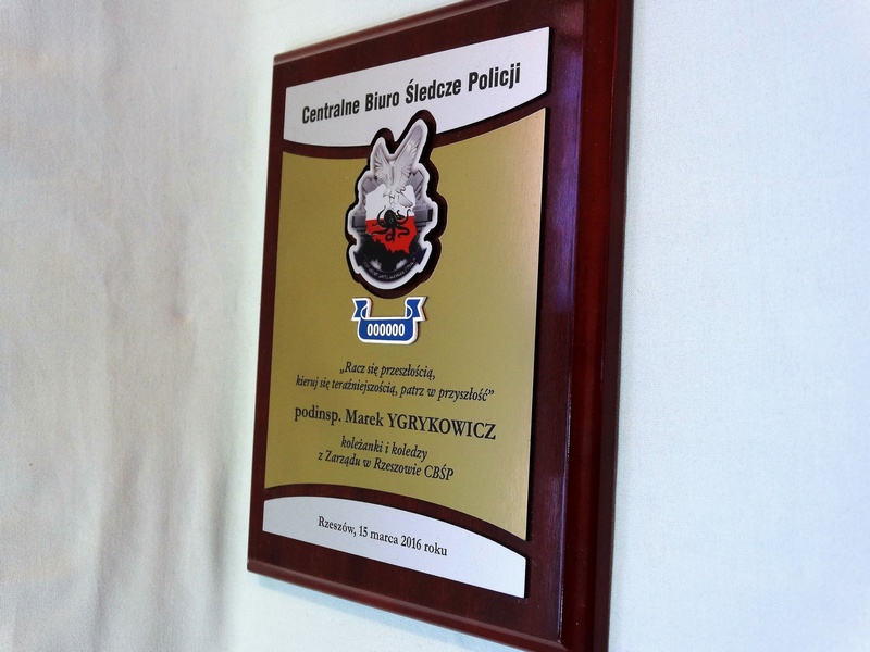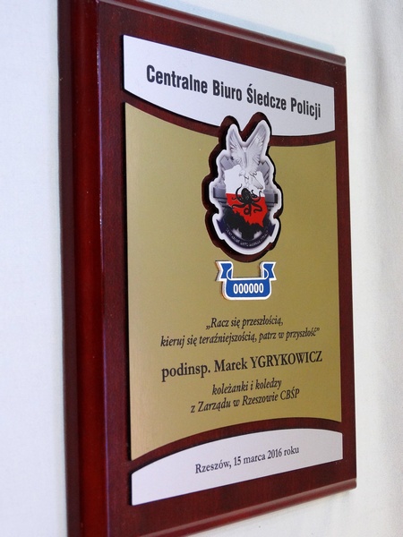 - wykonanej z laminatów i pleksy odznaki (herbu, loga)