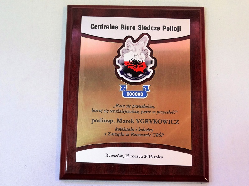 Pamiątkowy, pożegnalny dyplom z okazji zakończenia służby w postaci dyplomu drewnianego złożonego na lakierowanym drewnianym podkładzie.