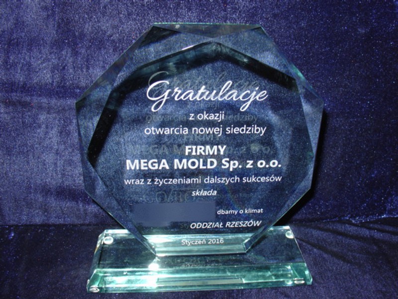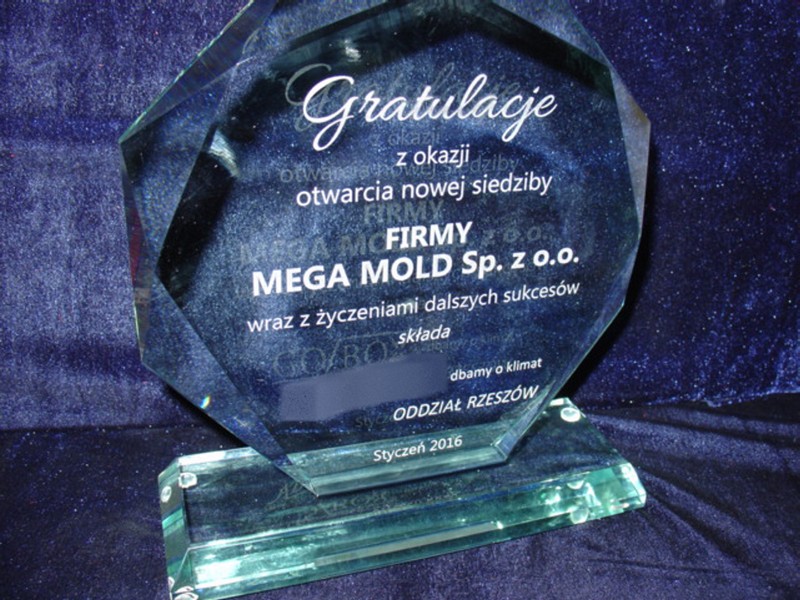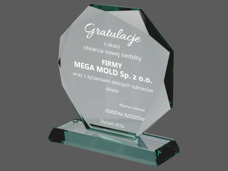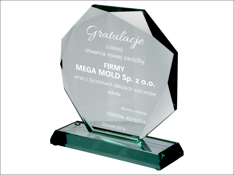 Pamiątkowa statuetka szklana G020 z grubego szlifowanego szkła z grawerem gratulacji dla firmy.