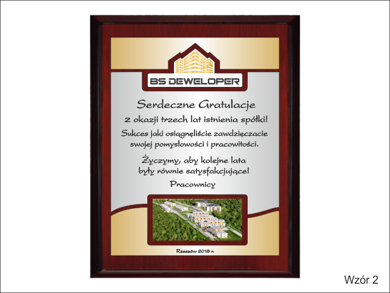 Gratulacje z okazji jubileuszu firmy w postaci złożonego dyplomu okolicznościowego na lakierowanym podkładzie, składającego się: