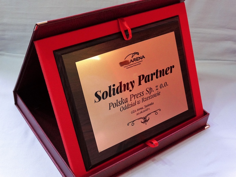 Wyróżnienie dla firmy w postaci dyplomu okolicznościowy na drewnianym podkładzie z blaszką z nadrukiem lub laminatem z grawerem.