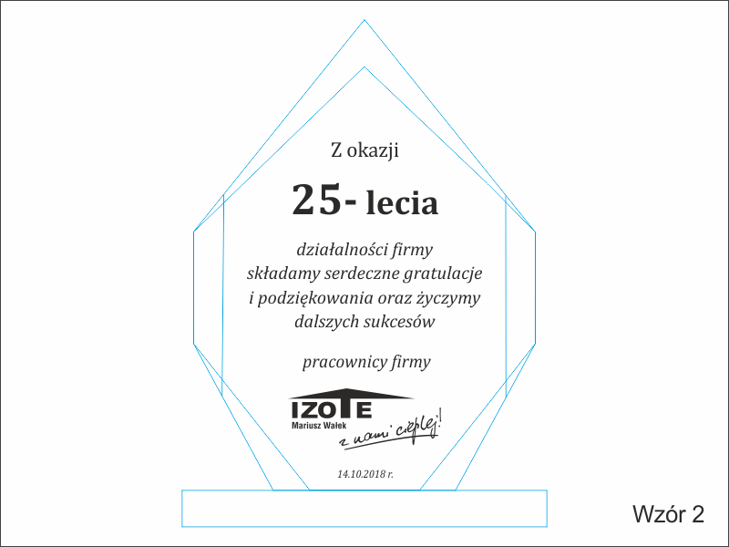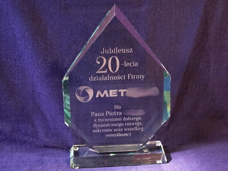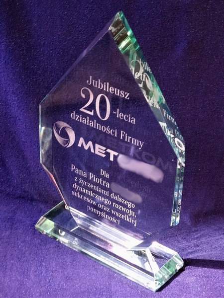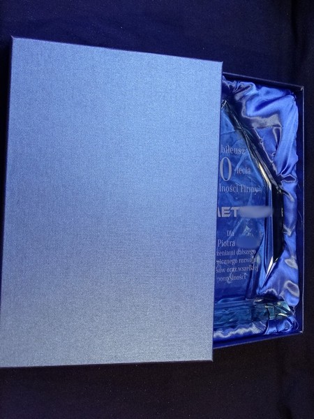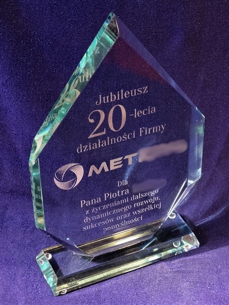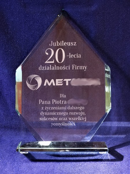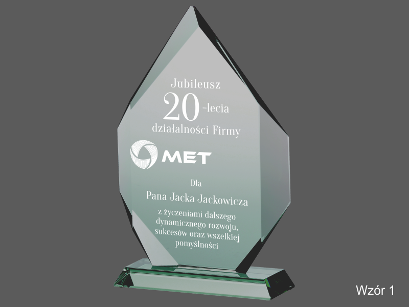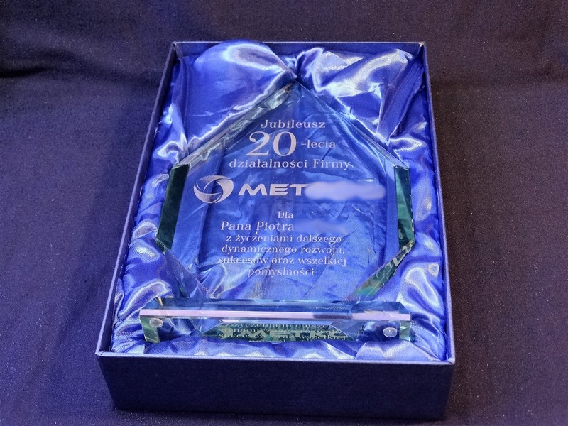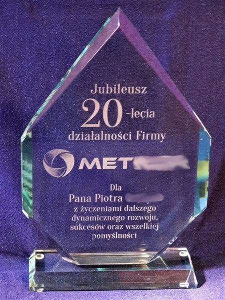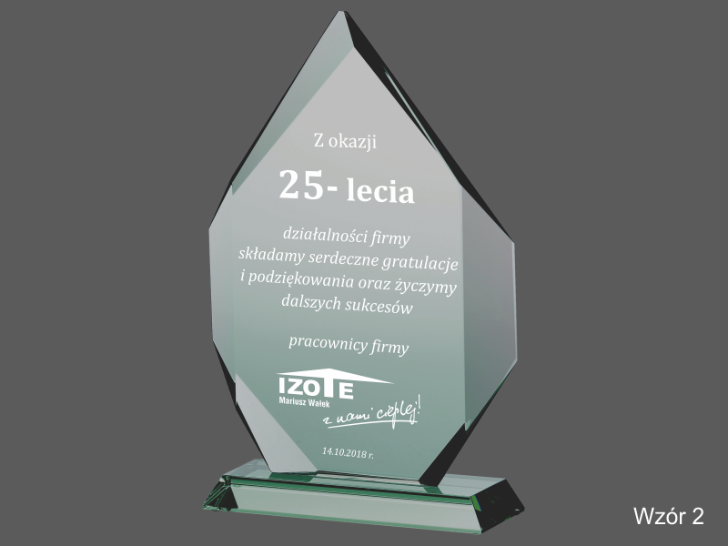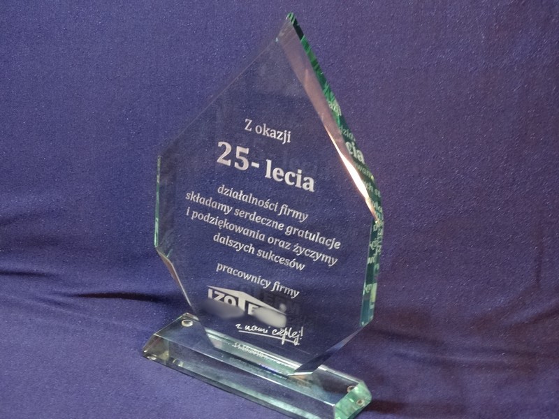 Pamiątkowa statuetka szklana G018 z grubego szlifowanego szkła z grawerem dedykacji z okazji Jubileuszu działalności Firmy.