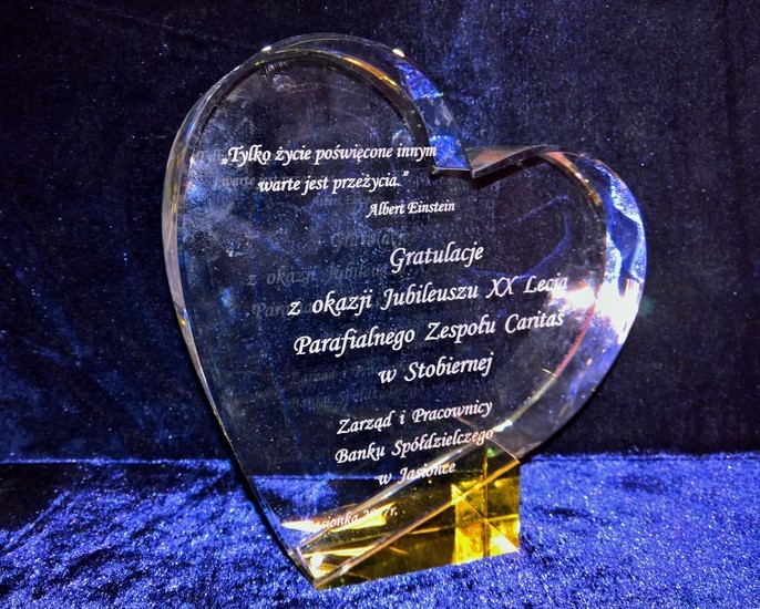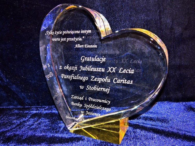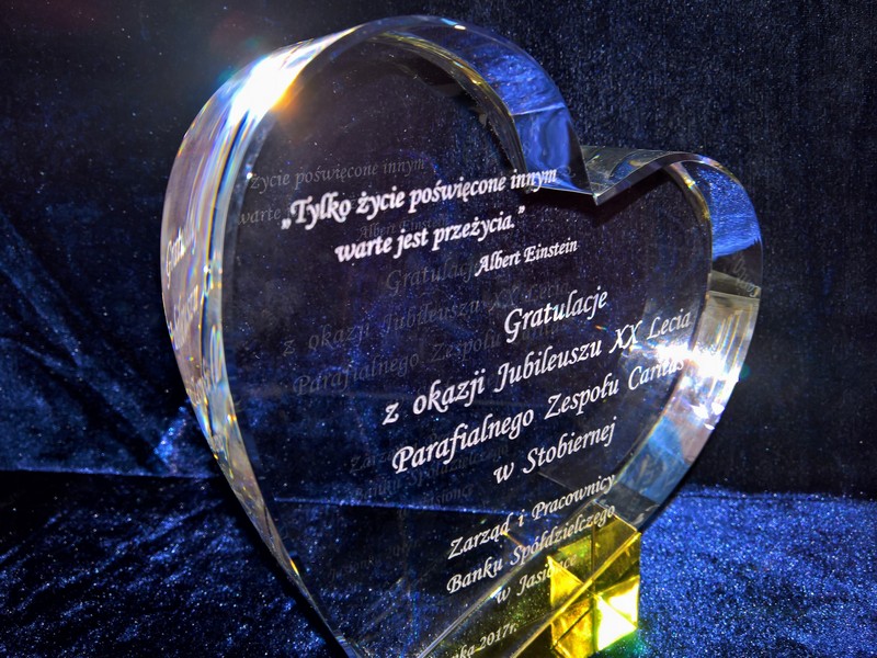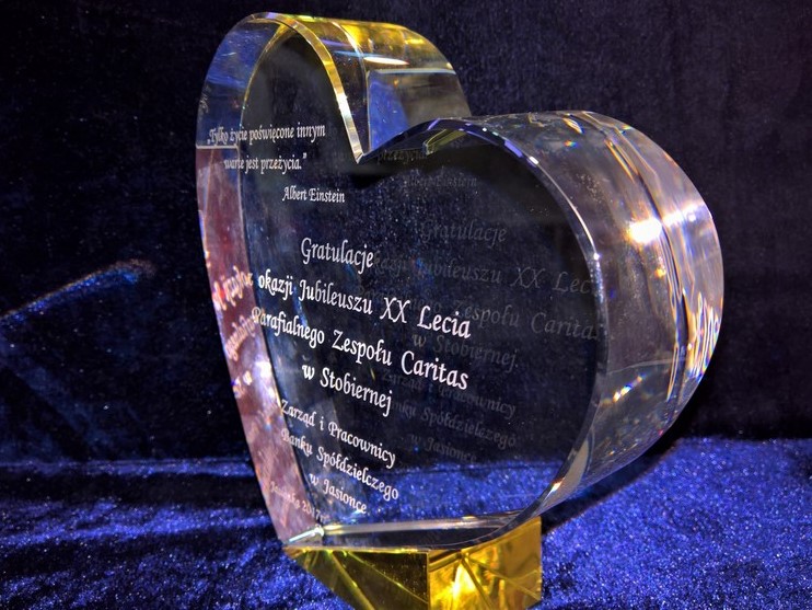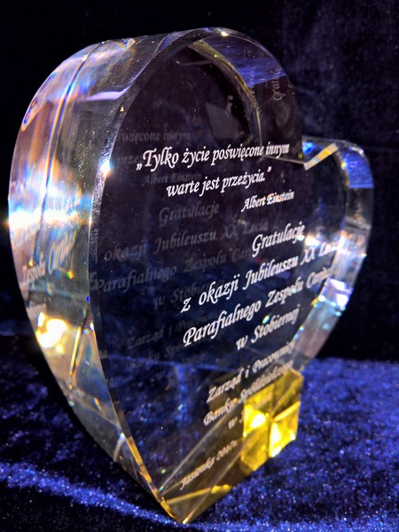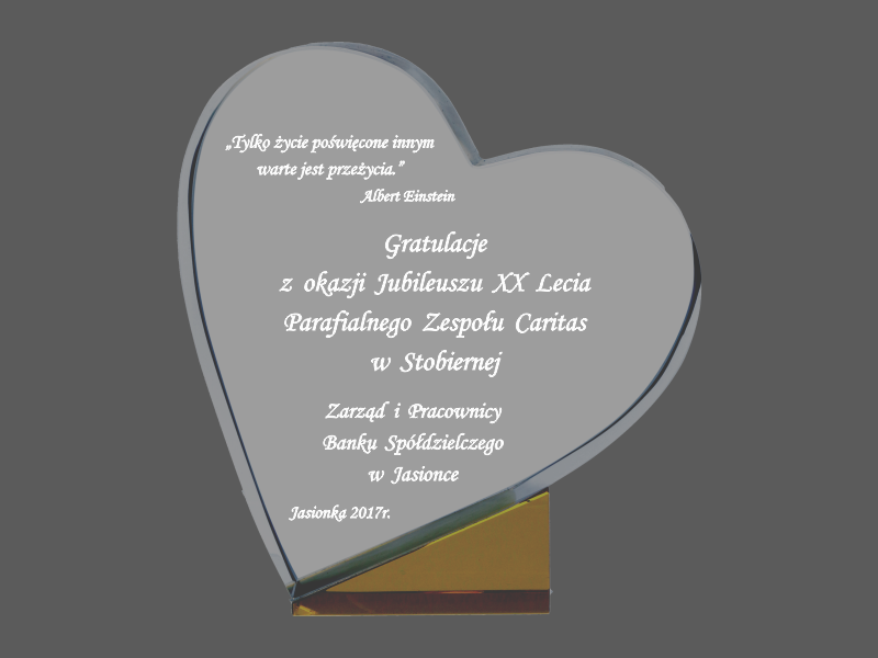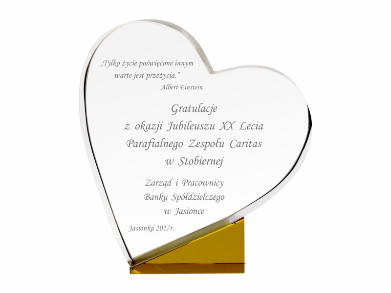 Pamiątkowa statuetka szklana C055 w kształcie serca, z grubego szlifowanego szkła z pamiątkowym grawerem z okazji Jubileuszu działalności.