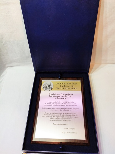 Pamiątka z okazji jubileuszu działalności instytucji w formie okolicznościowego złożonego dyplomu drewnianego, składającego się: