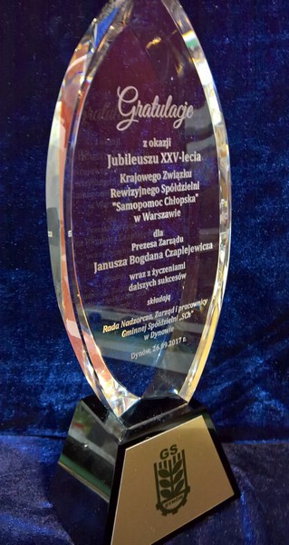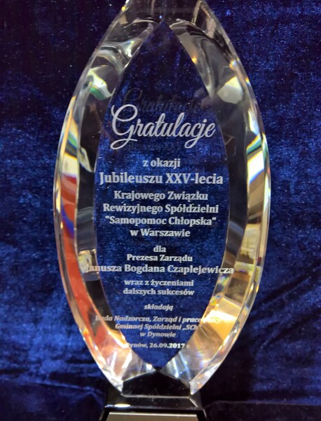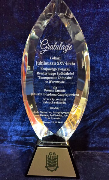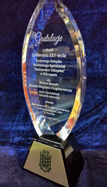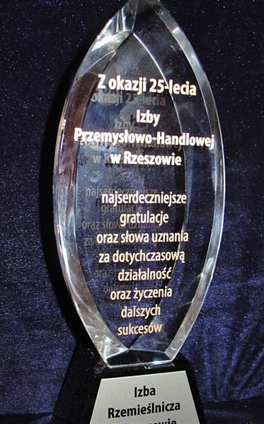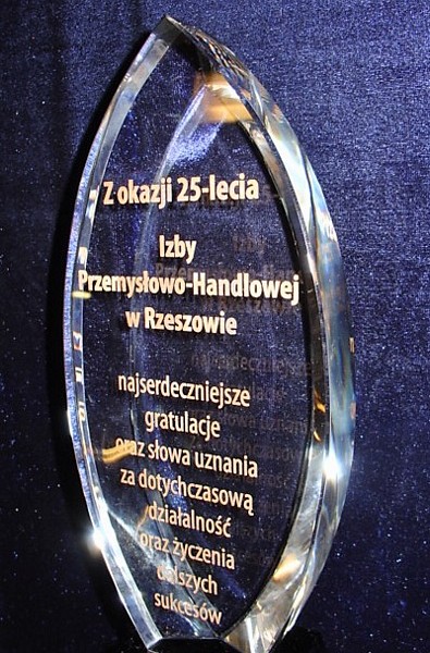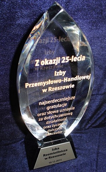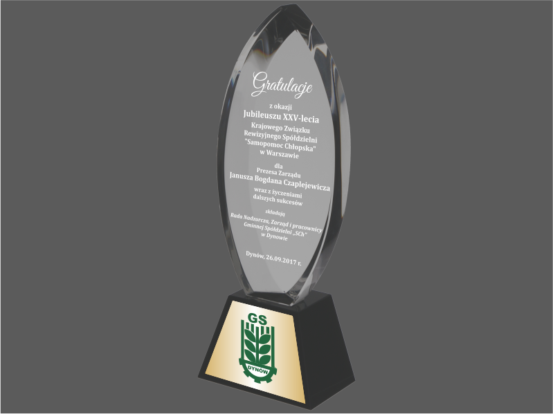 Statuetka szklana C034 z grubego szlifowanego szkła z grawerem dedykacji z okazji jubileuszu działalności.