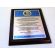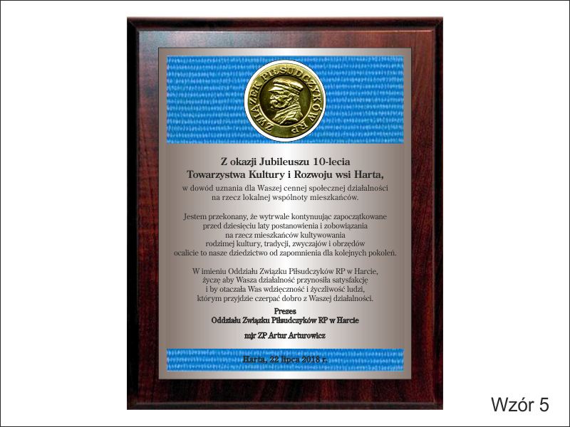 Wyrazy uznania z okazji jubileuszu działalności stowarzyszenia w postaci drewnianego dyplomu z blachą z nadrukiem.
