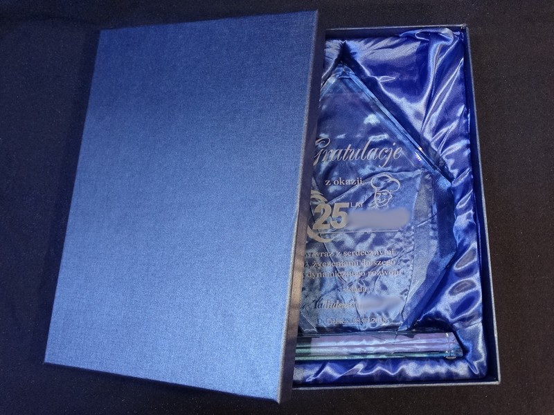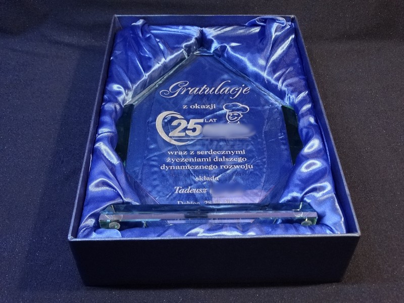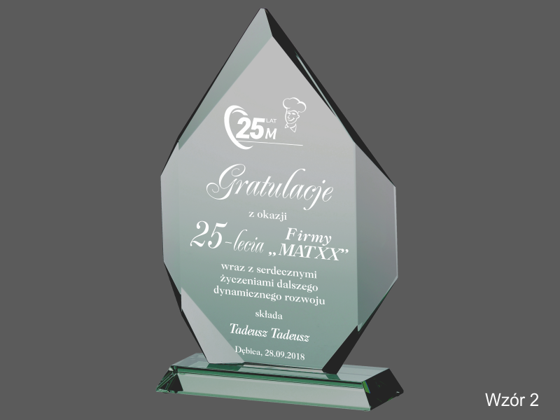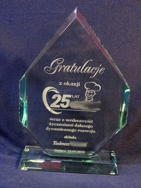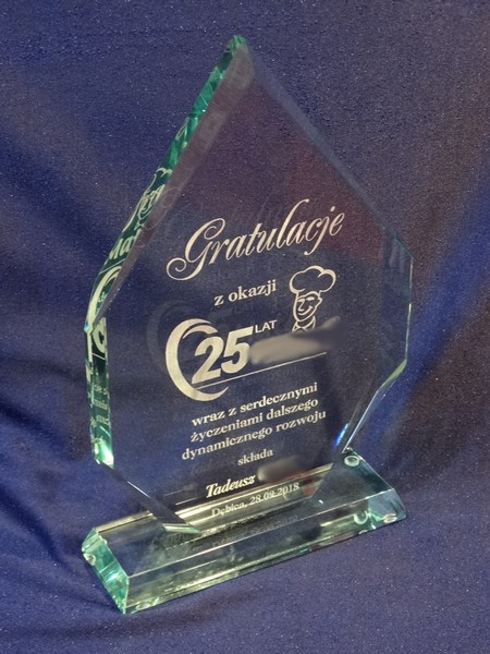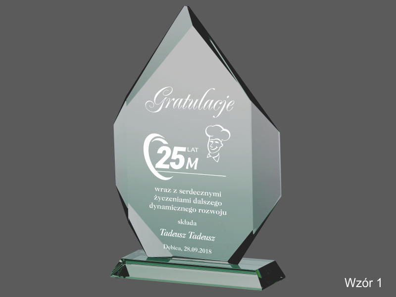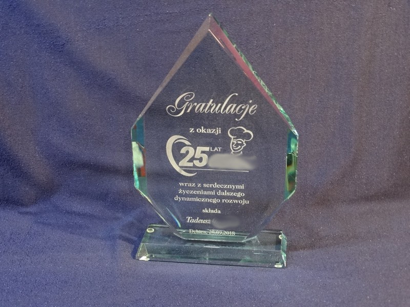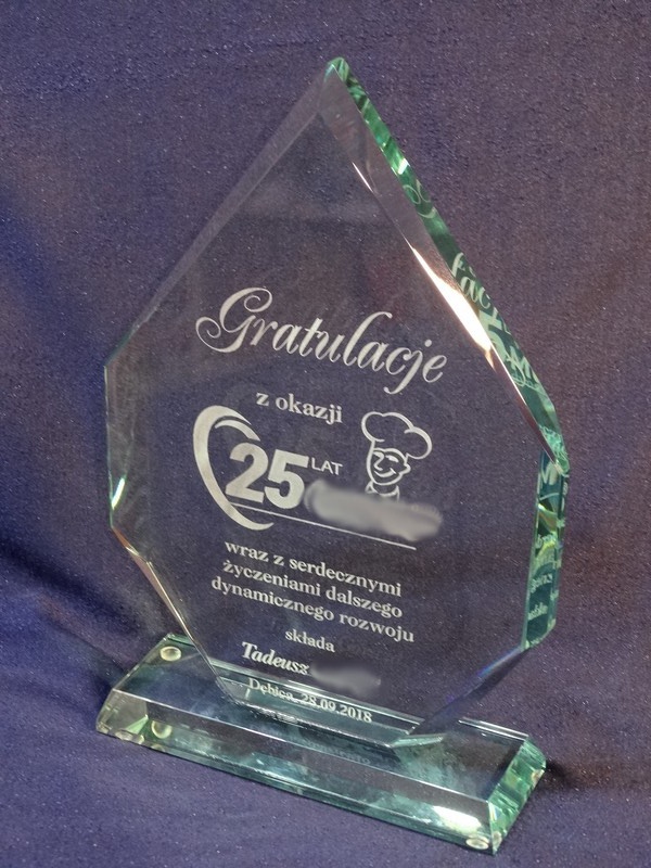 Pamiątkowa statuetka szklana G018 z grubego szlifowanego szkła z grawerem dedykacji z Gratulacjami z okazji Jubileuszu działalności Firmy.