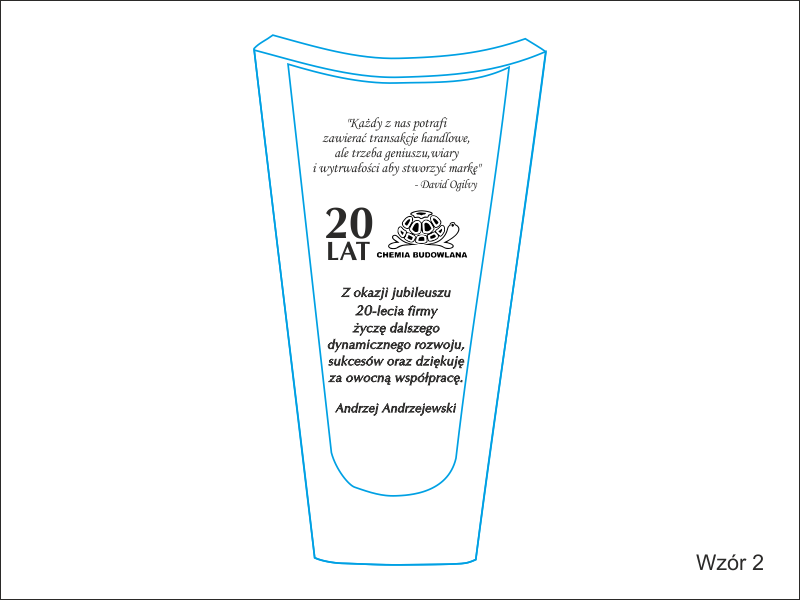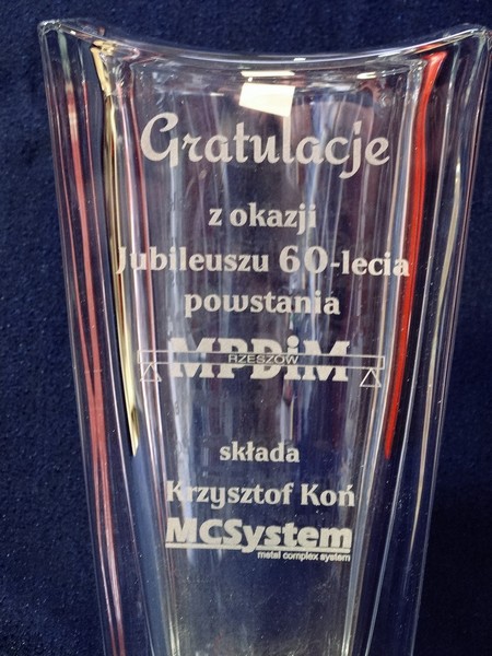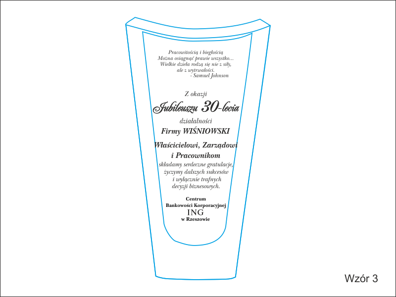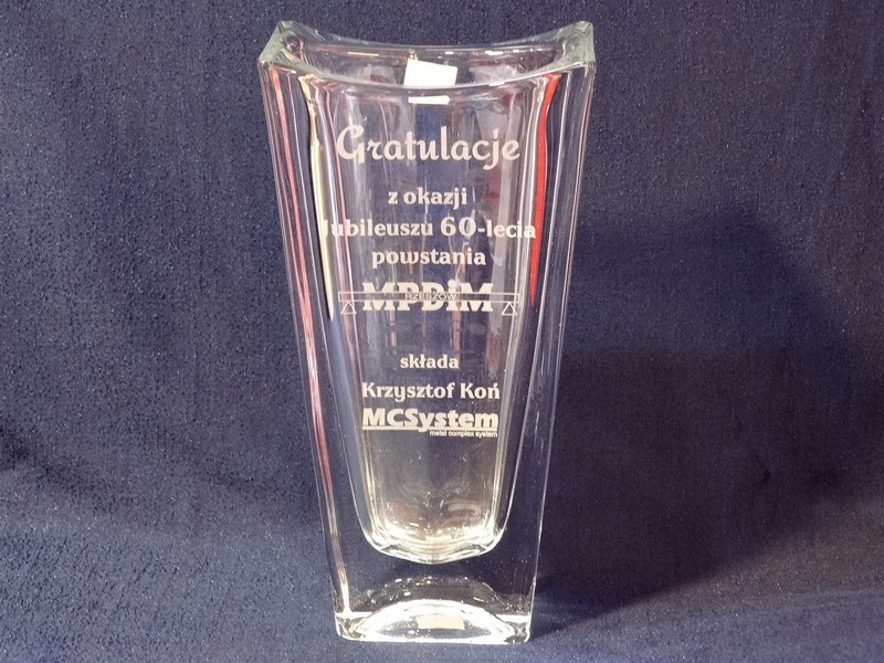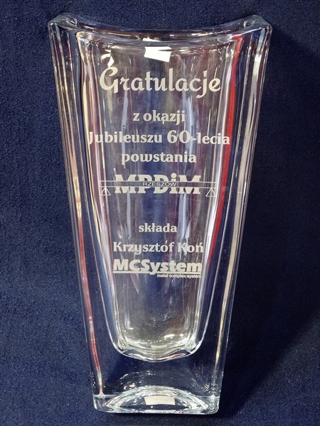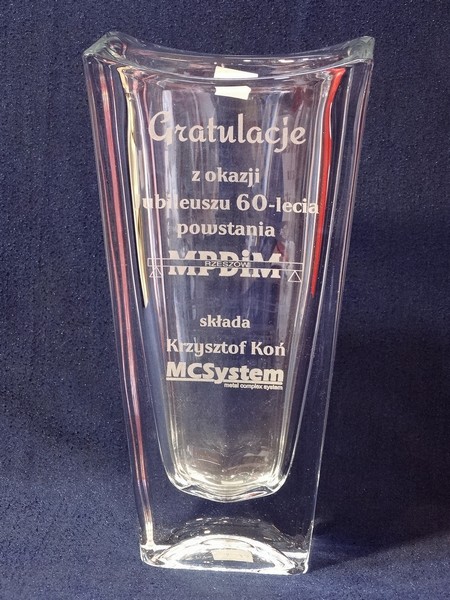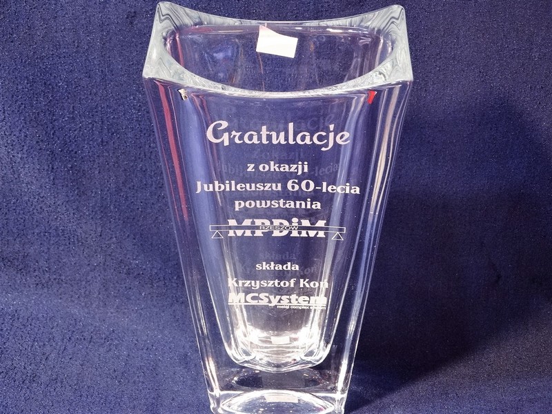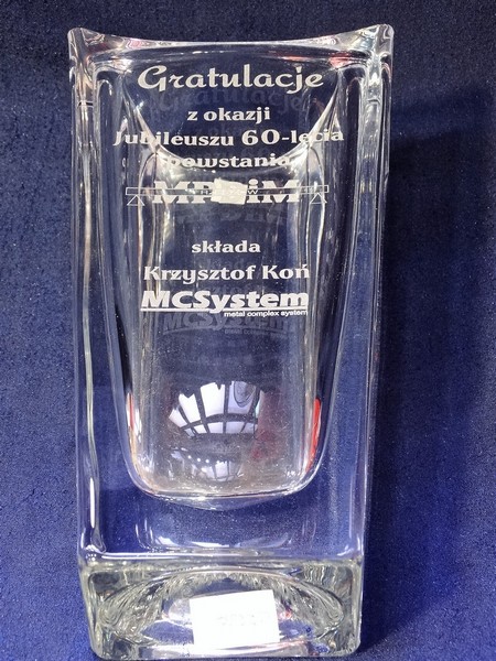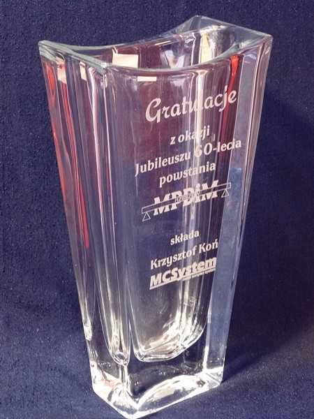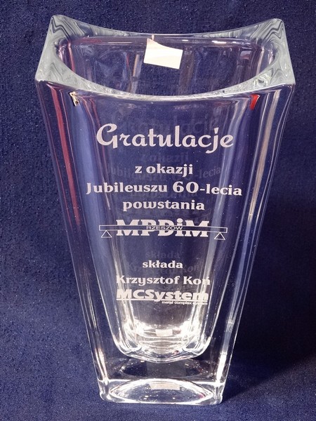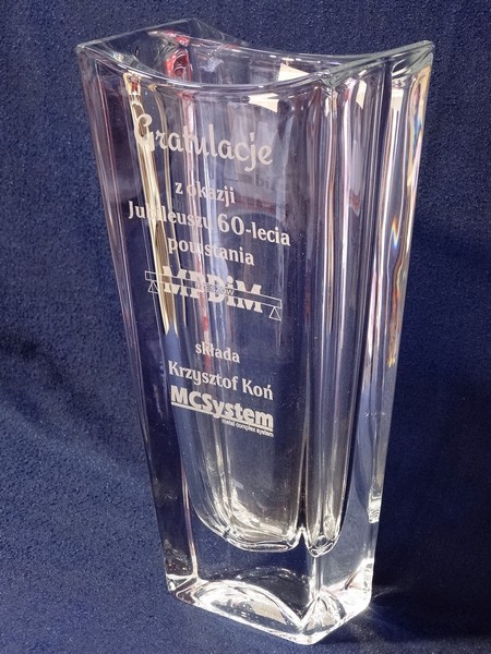 Na wazonie wykonany jest grawer ozdobnych grafik, loga i dedykacji z jubileuszowymi gratulacjami i podziękowaniem za współpracę.