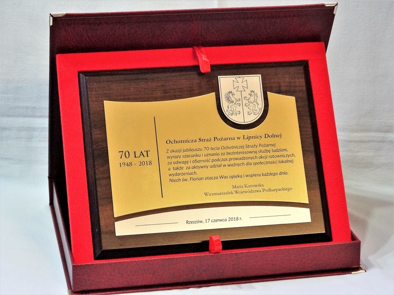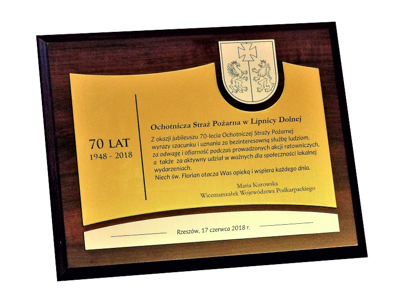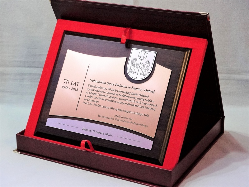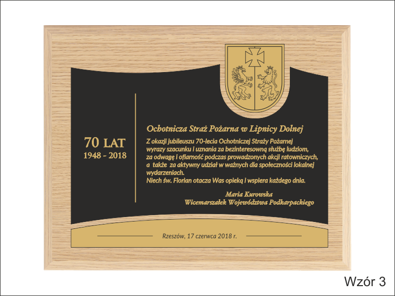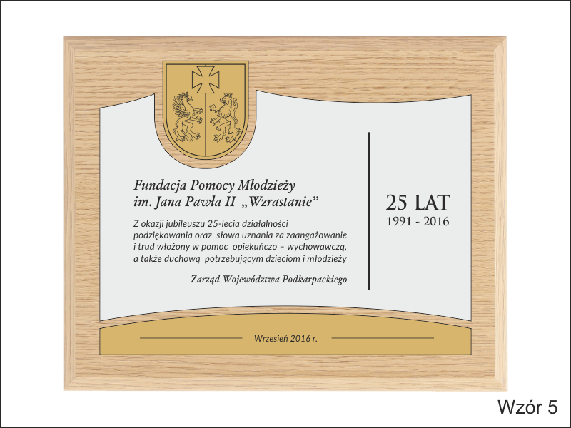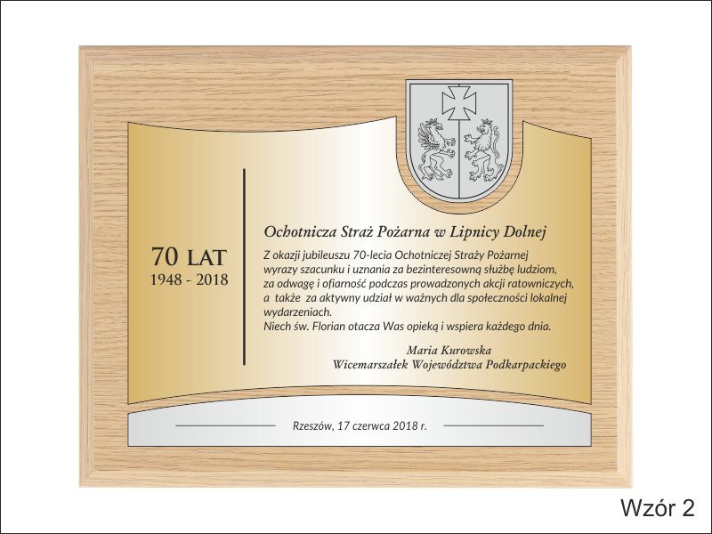 Pamiątkowy złożony dyplom okolicznościowy na standardowym drewnianym podkładzie z okazji jubileuszu funkcjonowania instytucji, składający się: