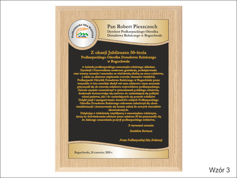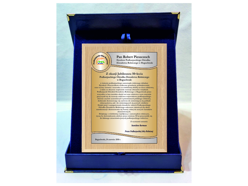Pamiątka jubileuszu działalności w formie dyplomu drewnianego złożonego, wykonanego z laminatów na standardowym podkładzie, składającego się: