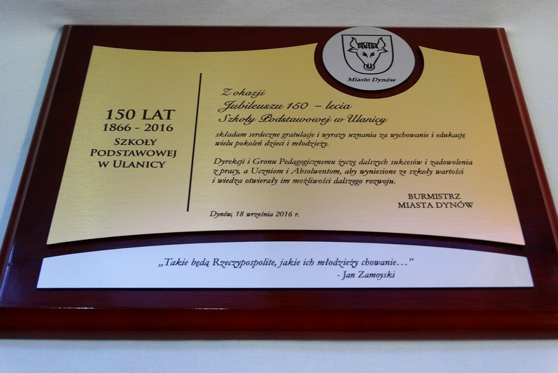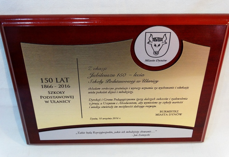 Pamiątkowy dyplom okolicznościowy na lakierowanym drewnianym podkładzie z okazji jubileuszu powstania szkoły, składający się: