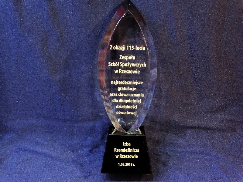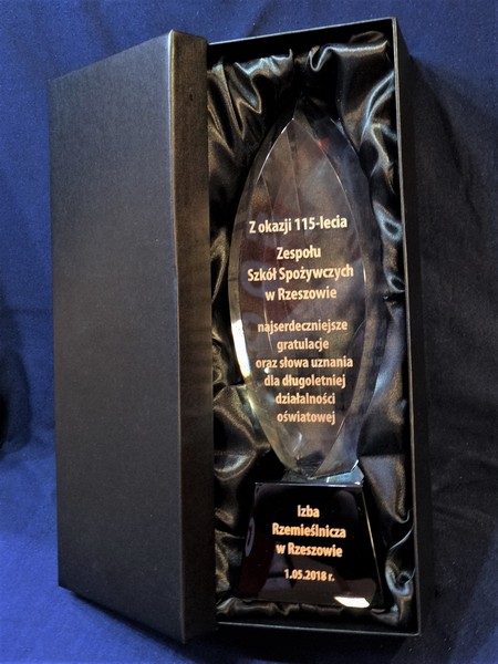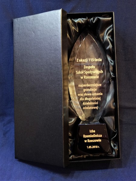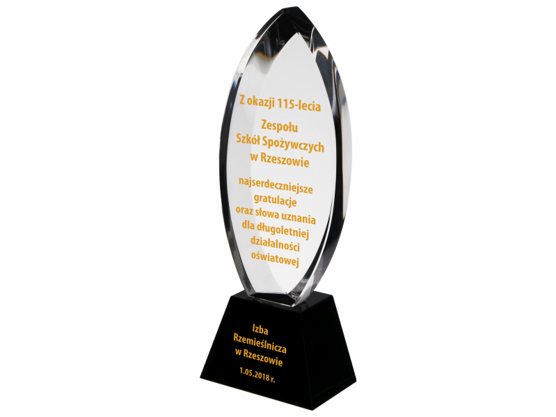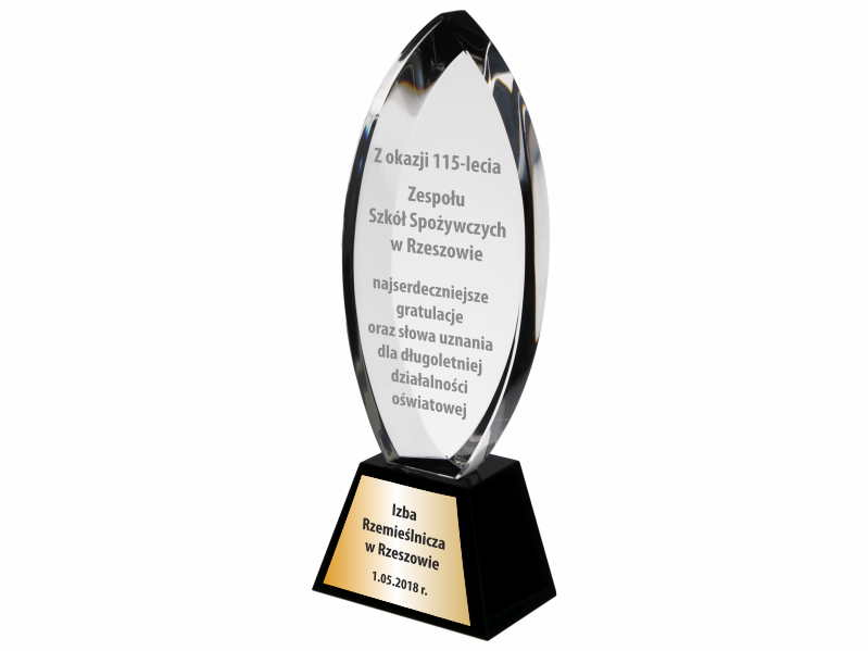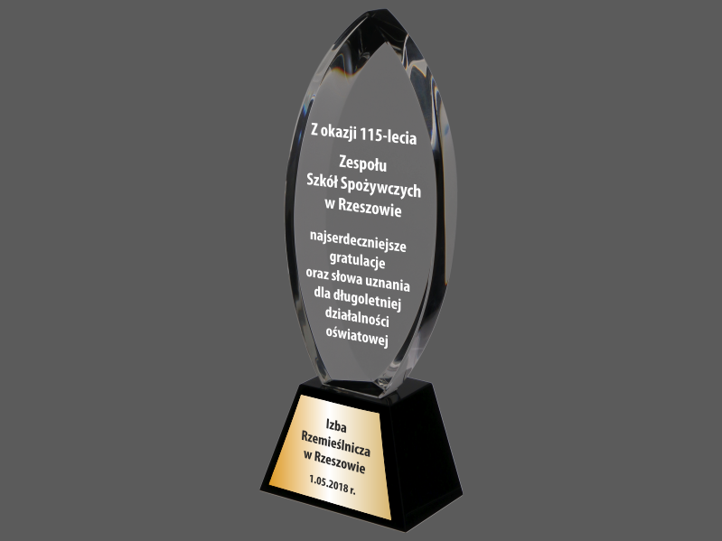 Pamiątkowa statuetka szklana C034 z grubego szlifowanego szkła z grawerem dedykacji z okazji Jubileuszu Szkoły.