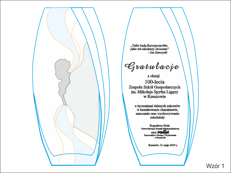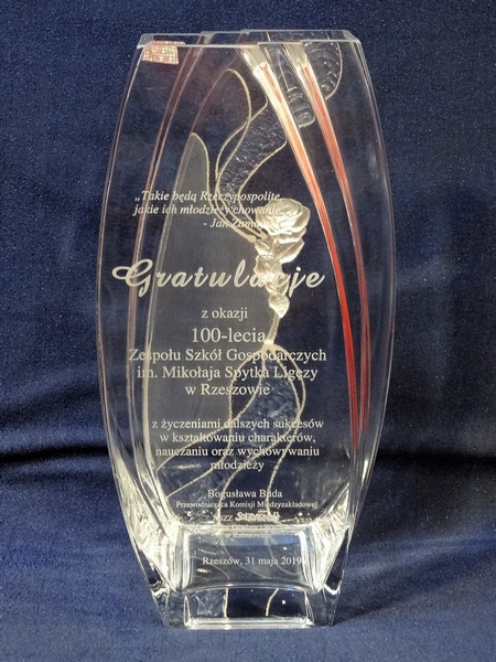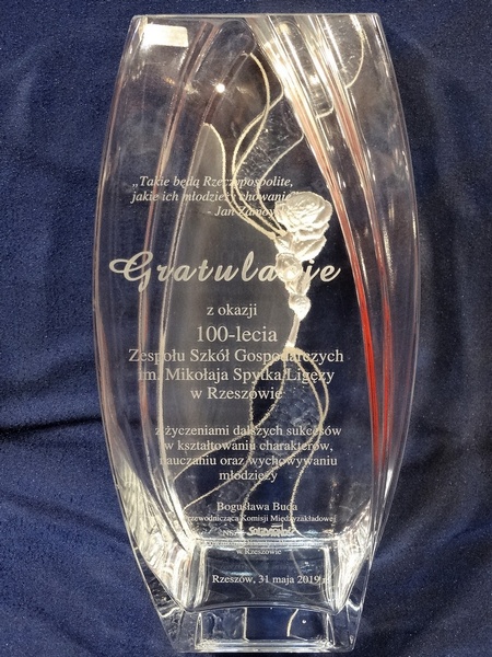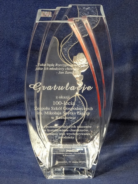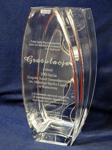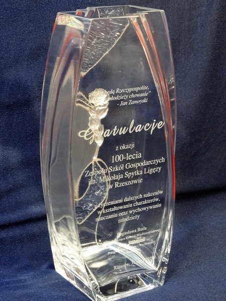 Na wazonie wykonany jest grawer ozdobnych grafik, loga i dedykacji z gratulacjami z okazji jubileuszu istnienia szkoły.