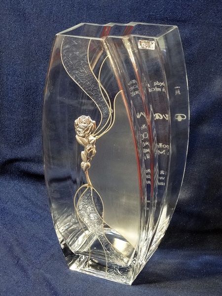 Pamiątka z okazji obchodów jubileuszu szkoły w postaci zdobionego szklanego wazonu Alina z ozdobną srebrną różą i grawerem.