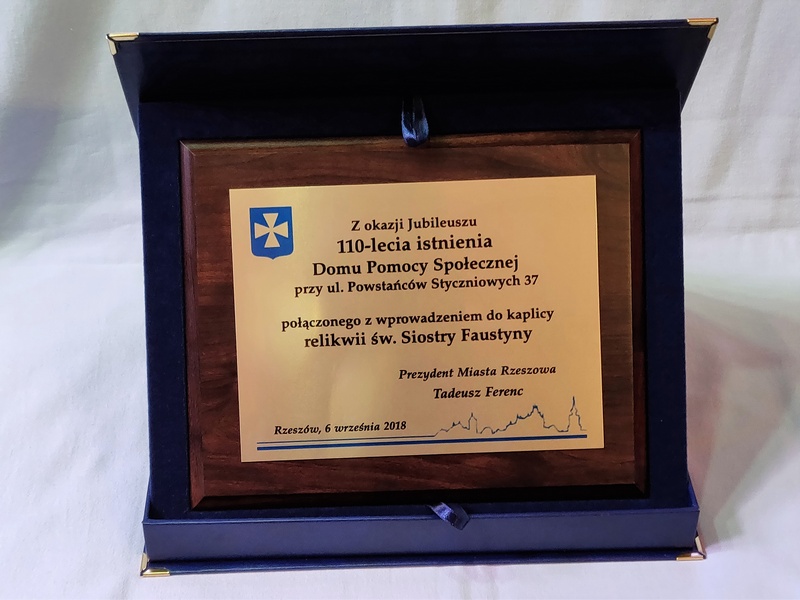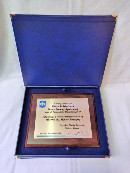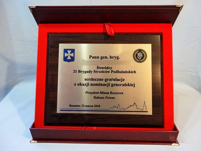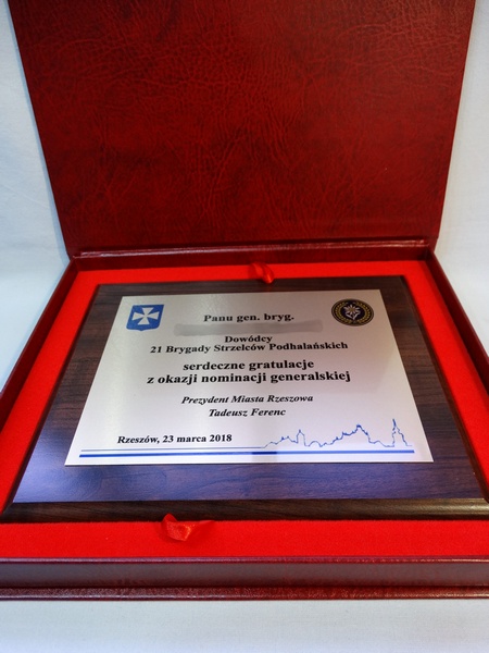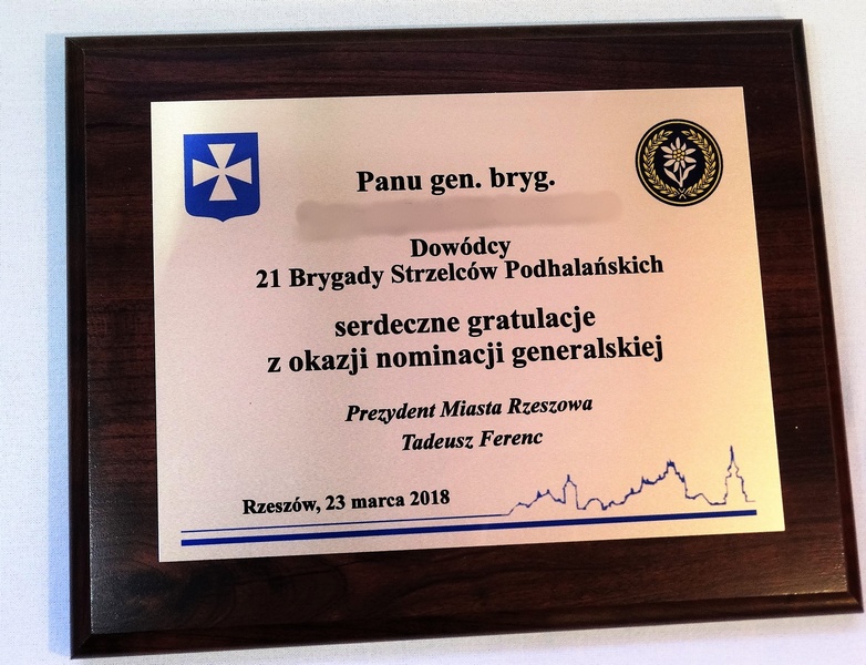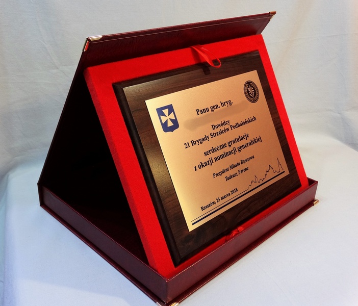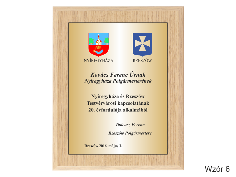 Urzędowa pamiątka w postaci dyplomu drewnianego poziomego na różne formalne i oficjalne okazje składający się z blachy z nadrukiem i drewnianego podkładu.