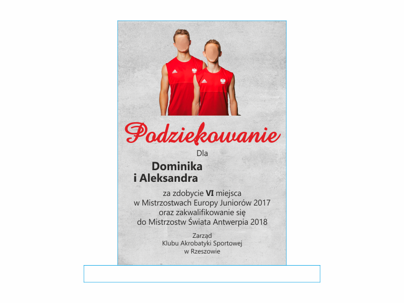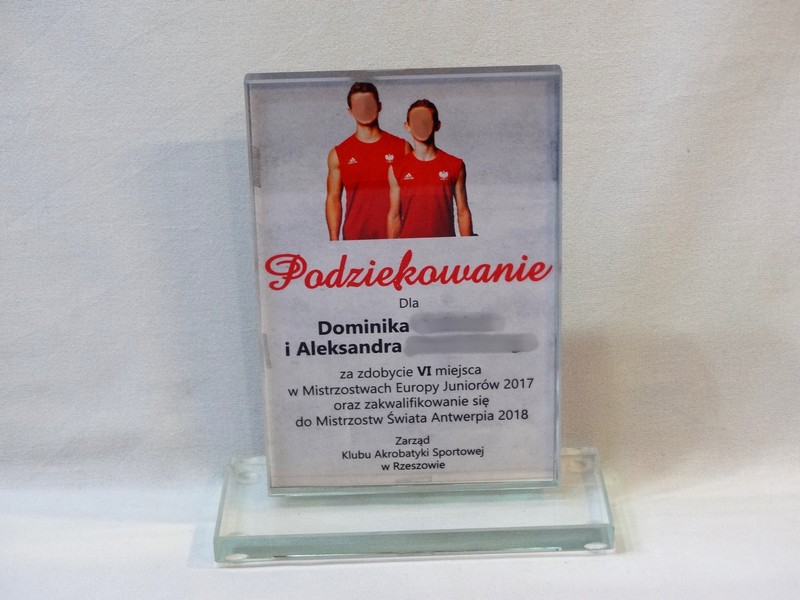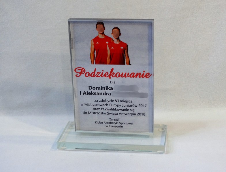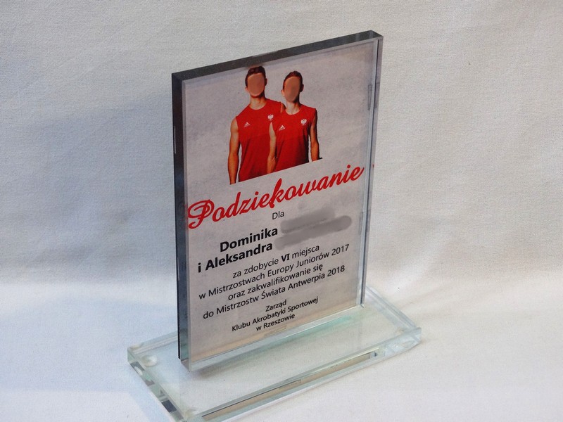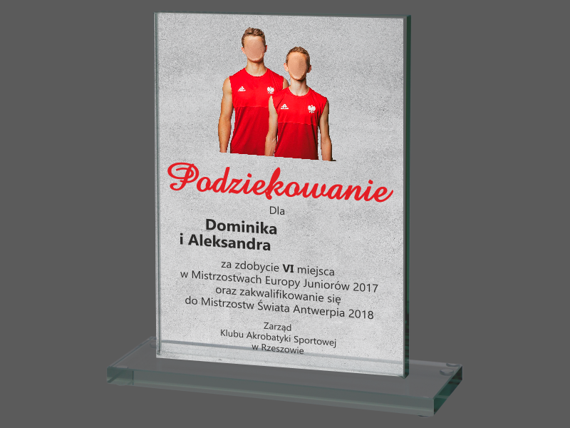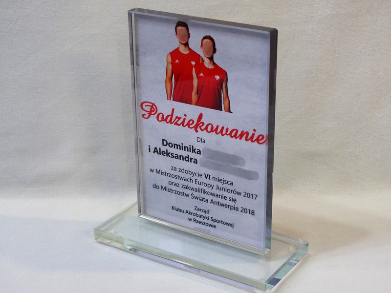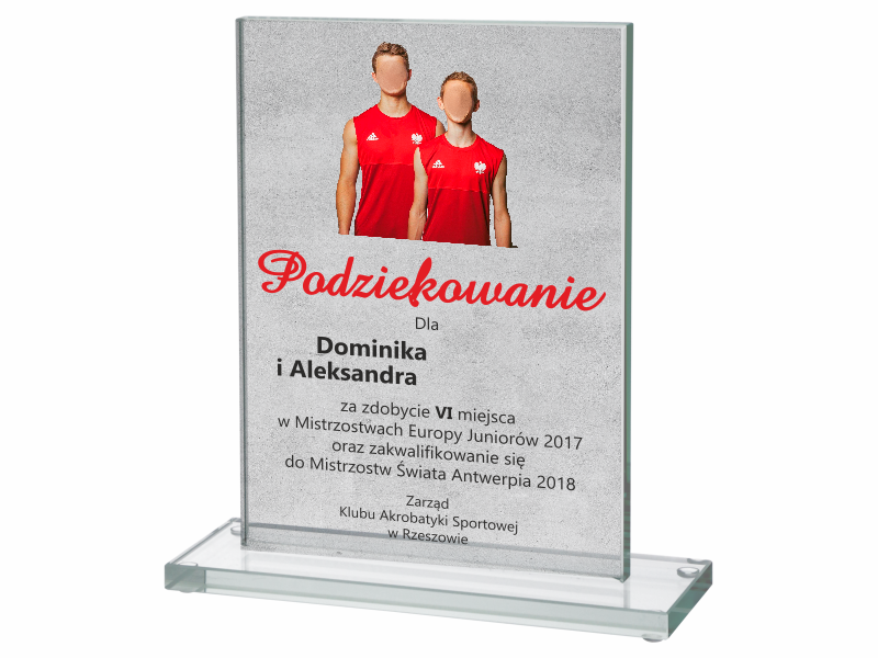 Podziękowanie za osiągnięcia sportowe w postaci statuetki szklanej 80033 z nadrukiem.