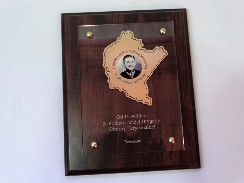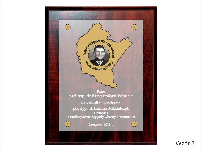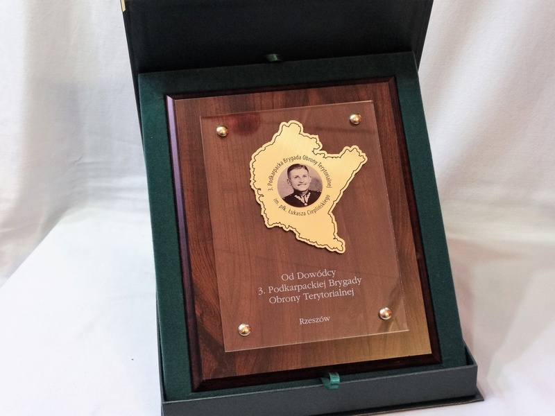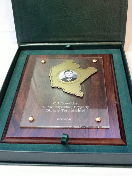 - z bezbarwnej pleksi z grawerem dedykacji oraz