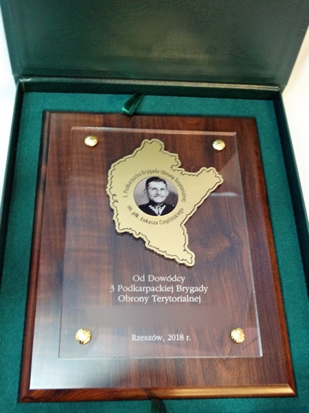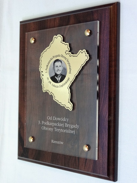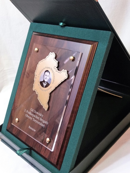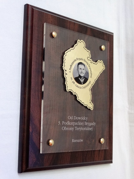 Pamiątkowy Ryngraf w postaci dyplomu drewnianego, składający się: