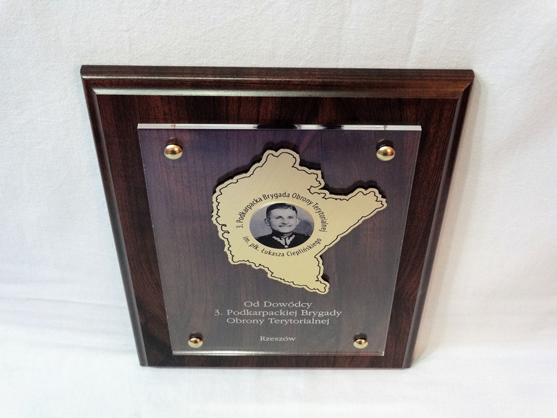 - z herbu / logotypu wyciętego i grawerowanego ze złotego laminatu