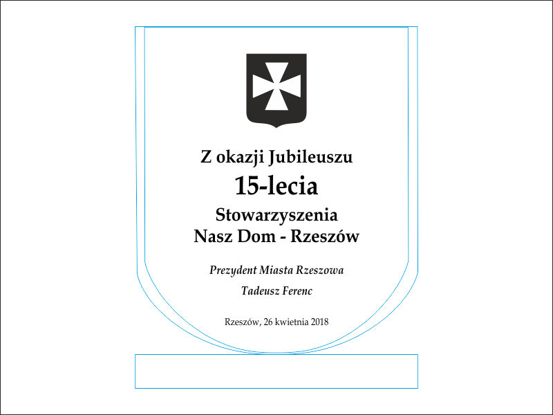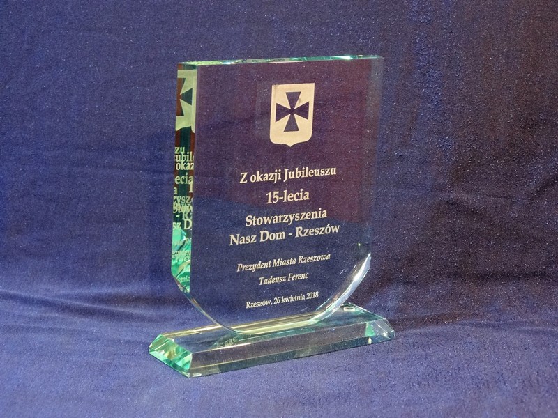 Statuetka szklana G001 z grubego szkła w kształcie tarczy herbowej z grawerem dedykacji i grafik z okazji Jubileuszu Stowarzyszenia.