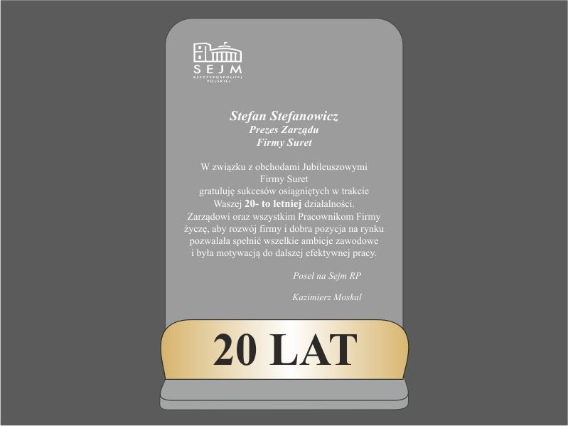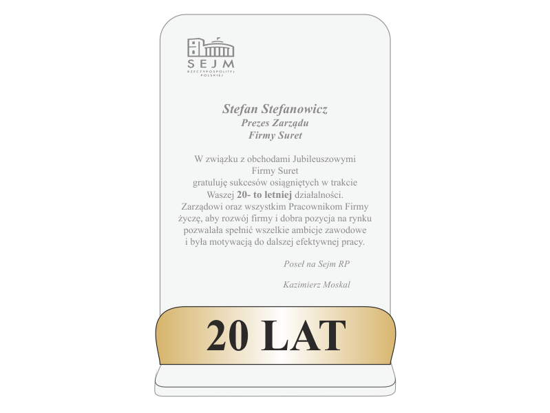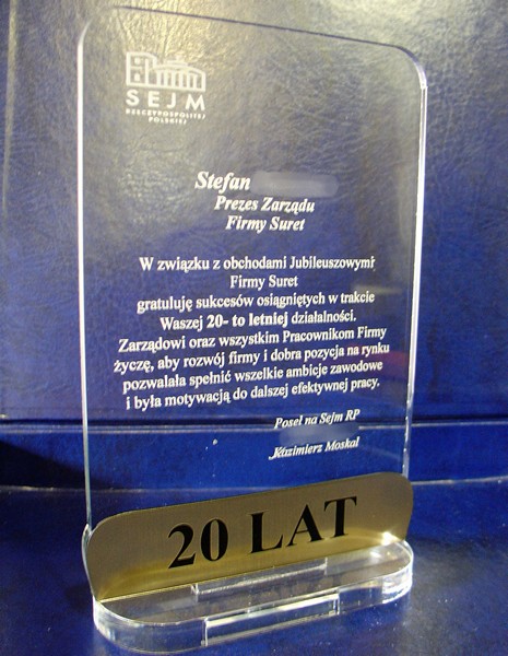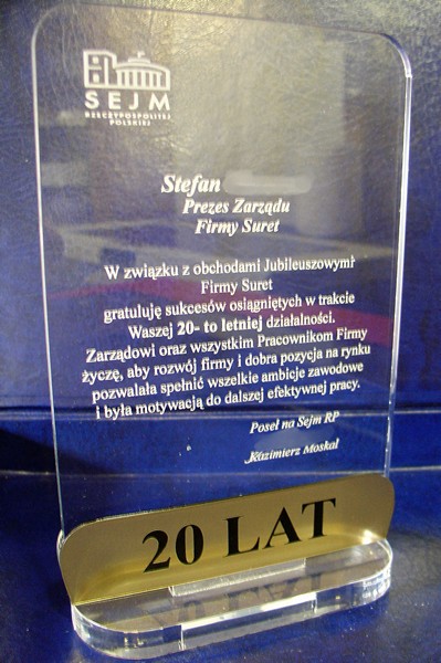 Statuetka z bezbarwnej pleksi z grawerem dedykacji z okazji jubileuszu działalności firmy.