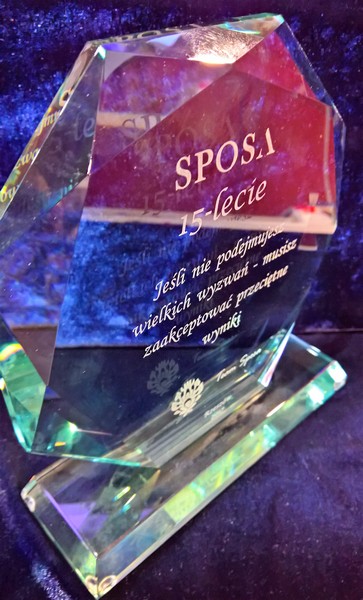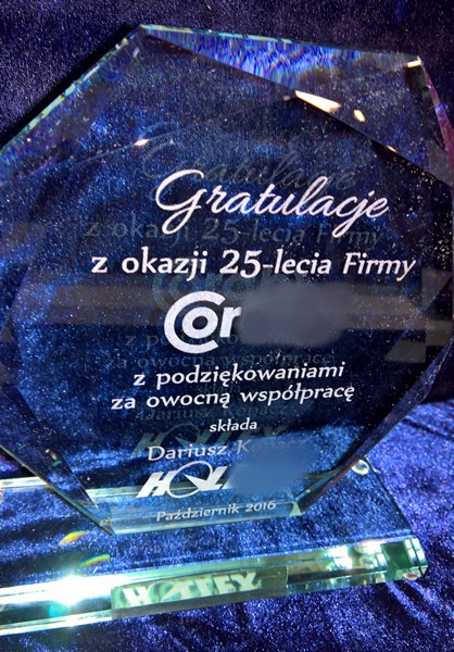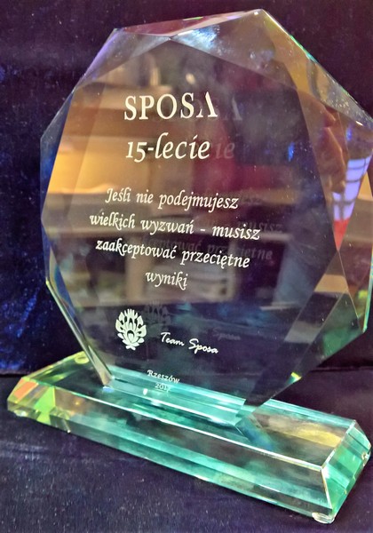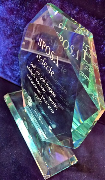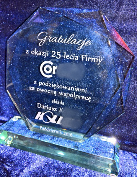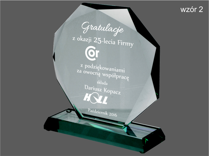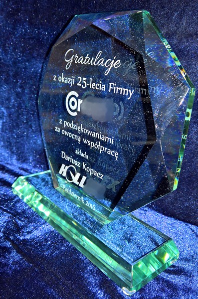 Pamiątkowa statuetka szklana G020 z grubego szlifowanego szkła z grawerem dedykacji z okazji jubileuszu firmy.