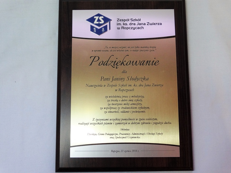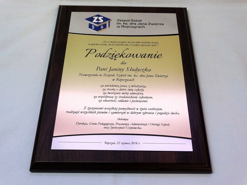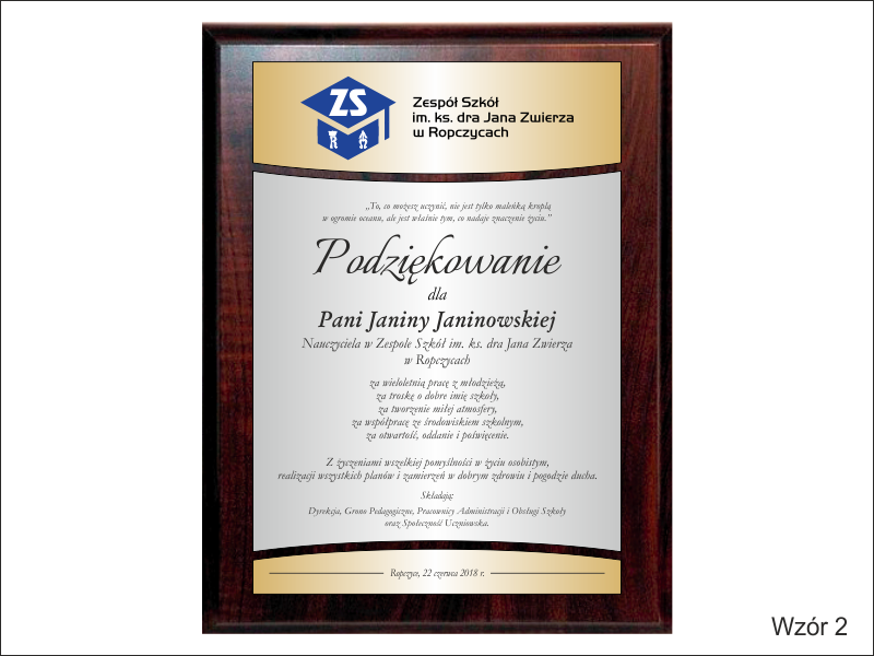 Podziękowanie dla nauczyciela w postaci okolicznościowego dyplomu drewnianego wykonanego na standardowym podkładzie, składający się: