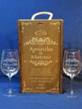 Pamiątka Ślubu - skrzynka na wino podwójna bejcowana i kieliszki z grawerem