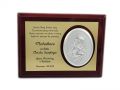 Pamiątka Chrztu Św. - srebrny owalny obrazek z Aniołkiem na wiśniowym drewnie