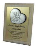Pamiątka Chrztu - srebrne Aniołki w sercu na złotej tabliczce i jasnym drewnie