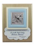 Pamiątka Chrztu Św. dla chłopczyka - srebrny Aniołek na materiale z grawerem na jasnym podkładzie