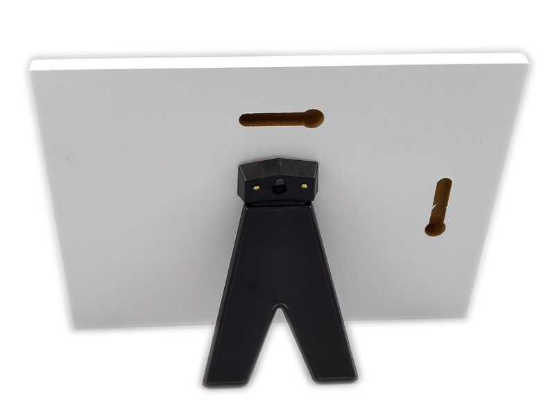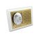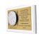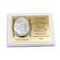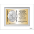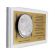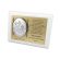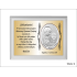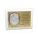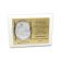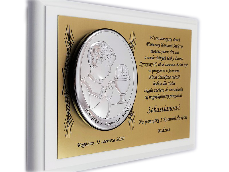 Upominek ma formę srebrnego obrazka umieszczonego na złotej tabliczce i białym podkładzie drewnianym.