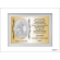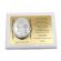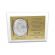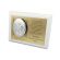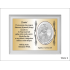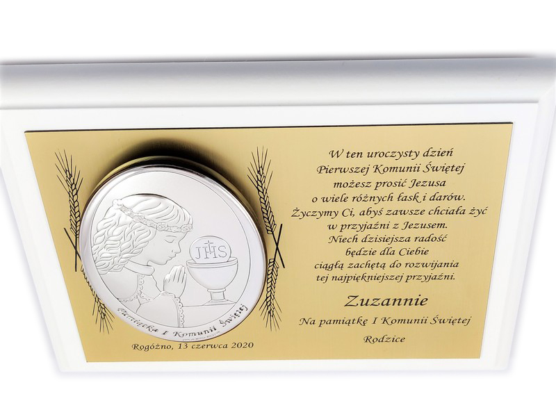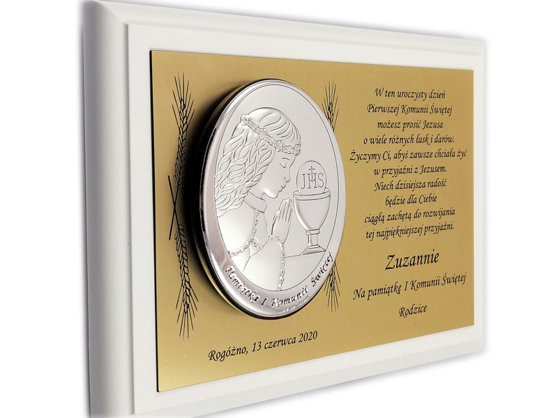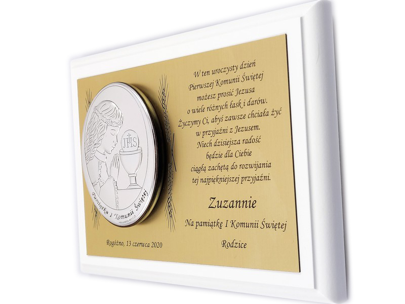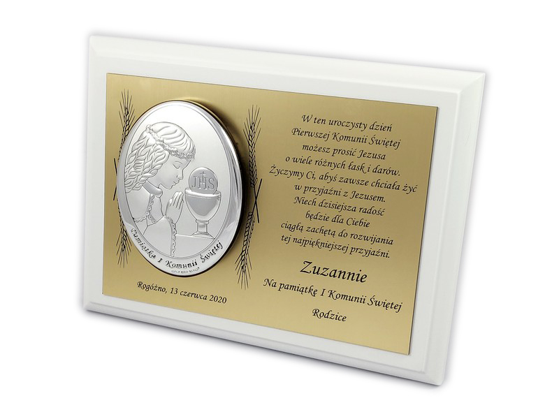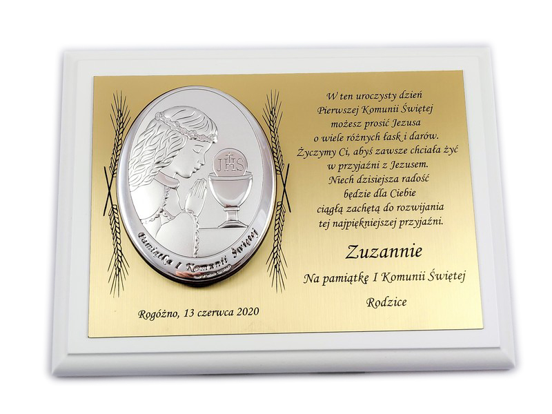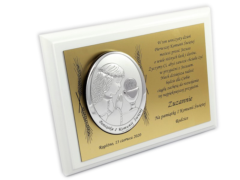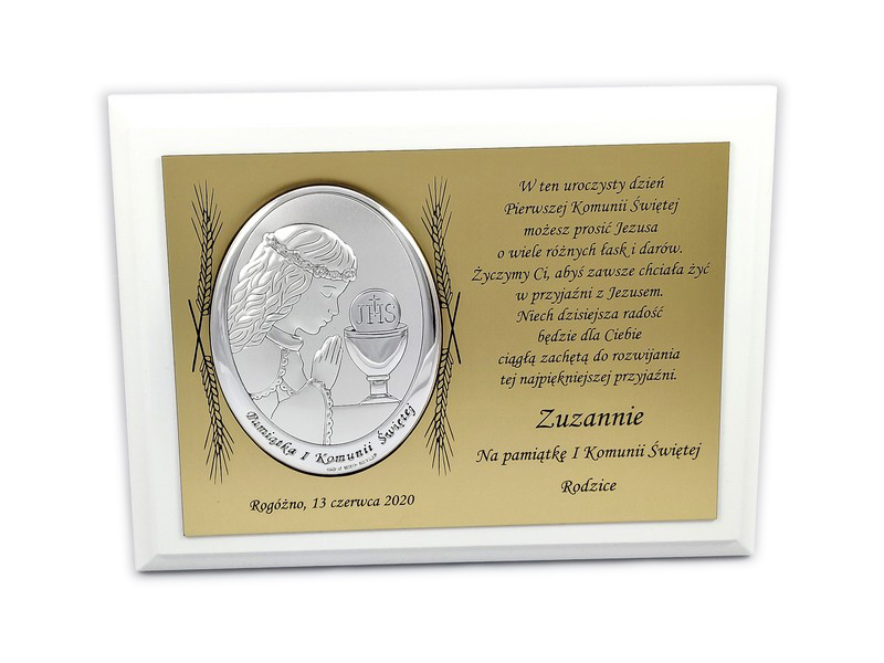 Upominek ma formę srebrnego obrazka umieszczonego na złotej tabliczce i białym podkładzie drewnianym.