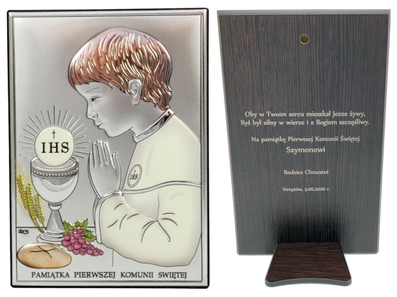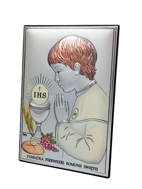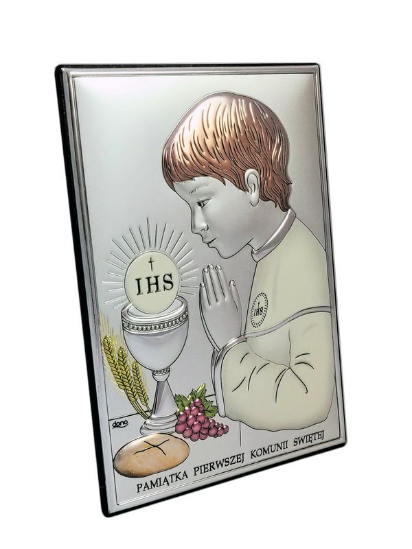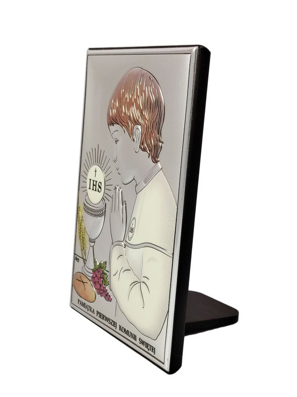 Srebrny obrazek DS04/CO w wersji z malowaniem ma prostokątny kształt i przedstawia wizerunek chłopczyka oraz kielich i Hostię.