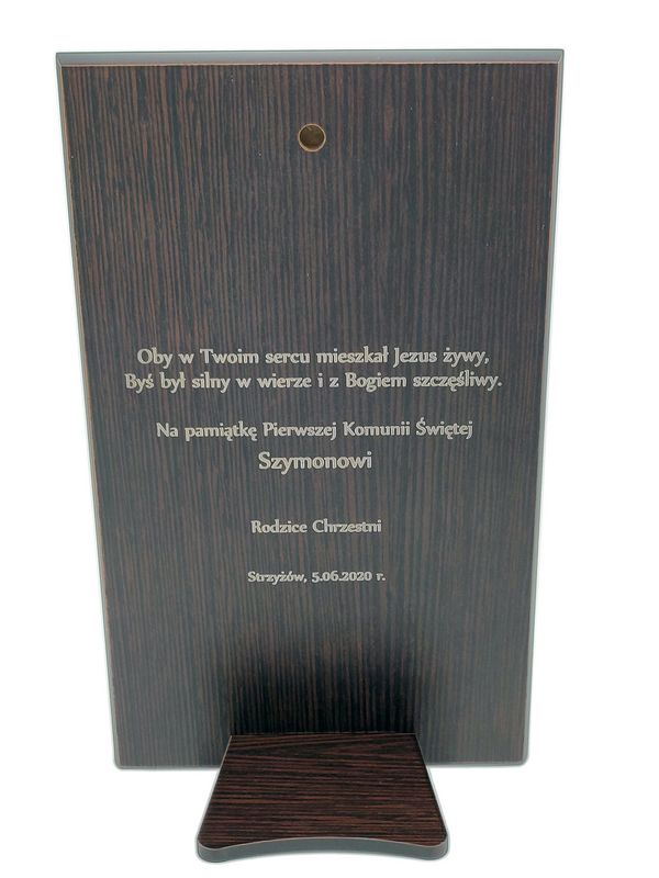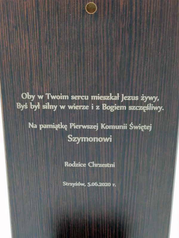 Na odwrocie obrazka można wygrawerować indywidualną pamiątkową dedykację z okazji przyjęcia I Komunii Św.