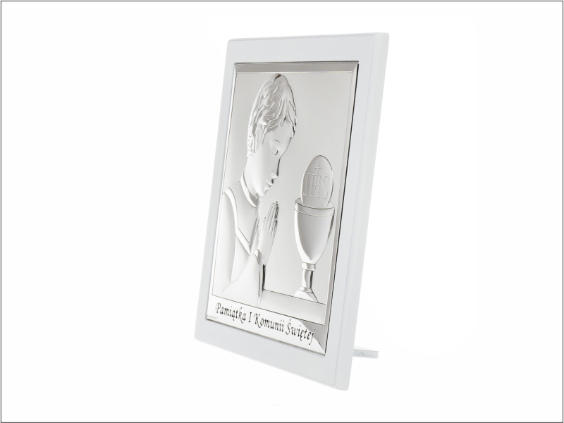 Srebrny Obrazek "Pamiątka I Komunii Św. dla chłopczyka kwadratowy z podpisem na białym drewnie 6568OW".
