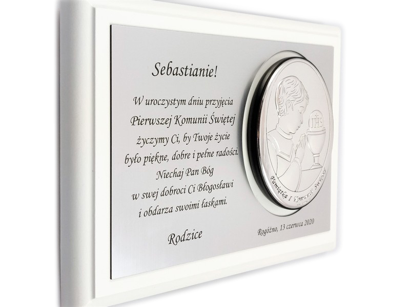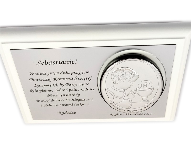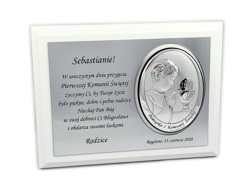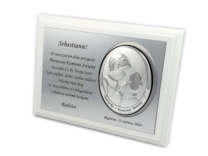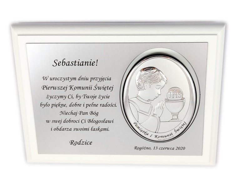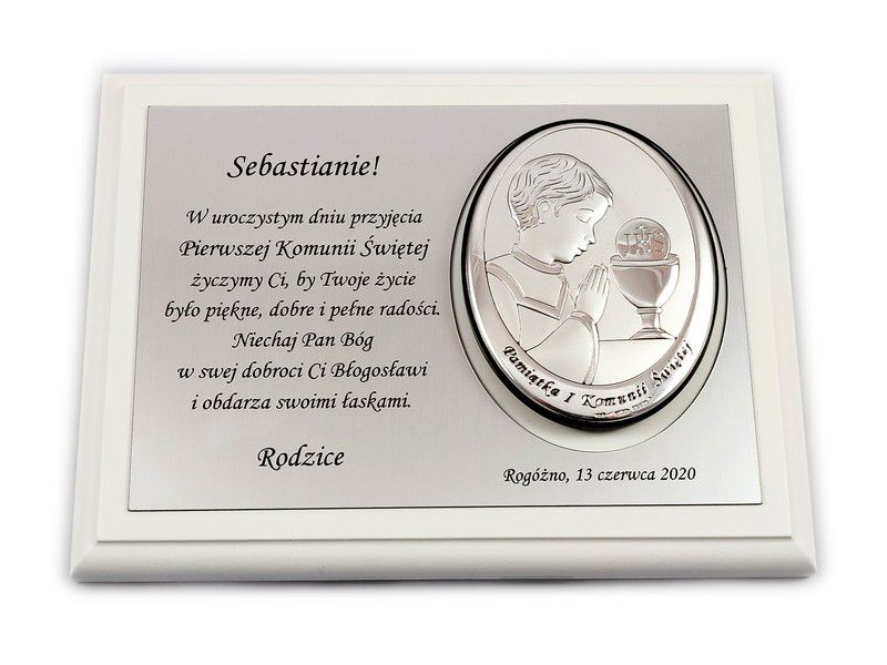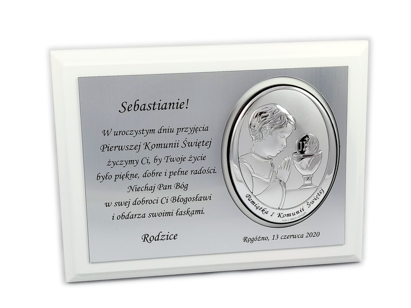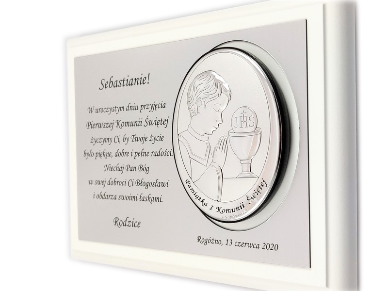 Pamiątkowy wyjątkowy upominek z okazji przyjęcia Pierwszej Komunii Świętej dla chłopczyka.