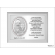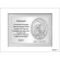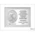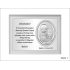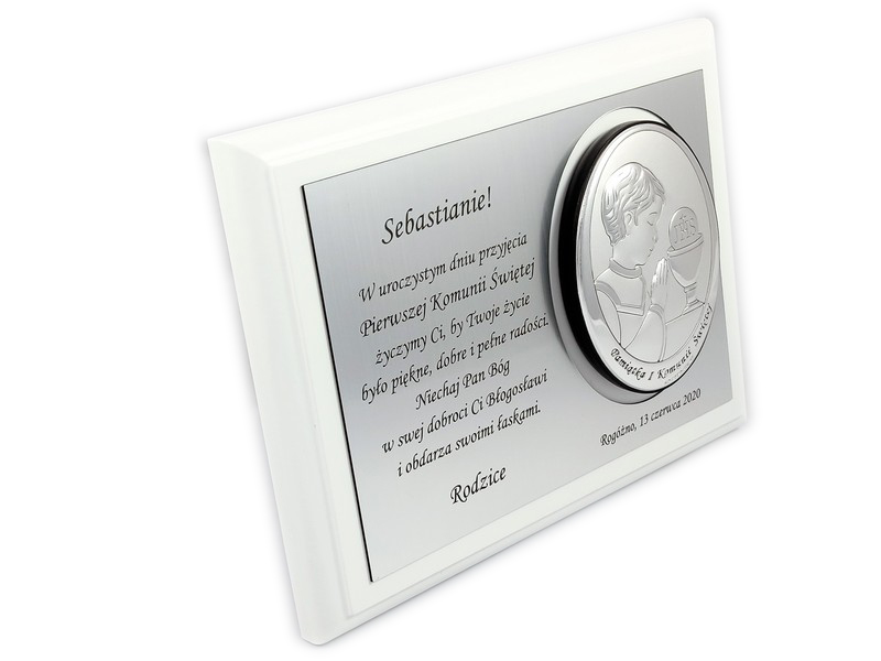 Upominek ma formę srebrnego obrazka umieszczonego razem ze srebrną tabliczką na drewnianym białym podkładzie.
