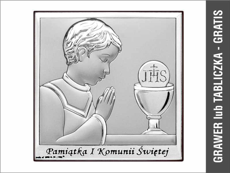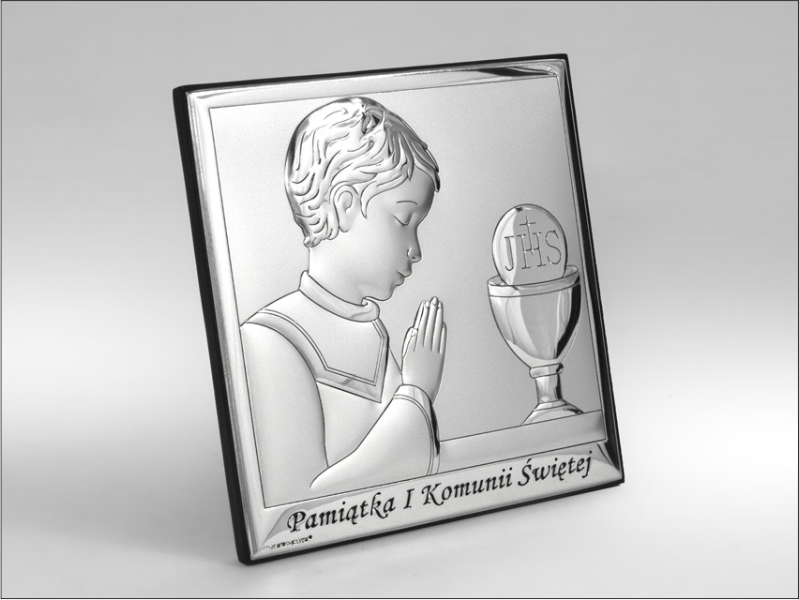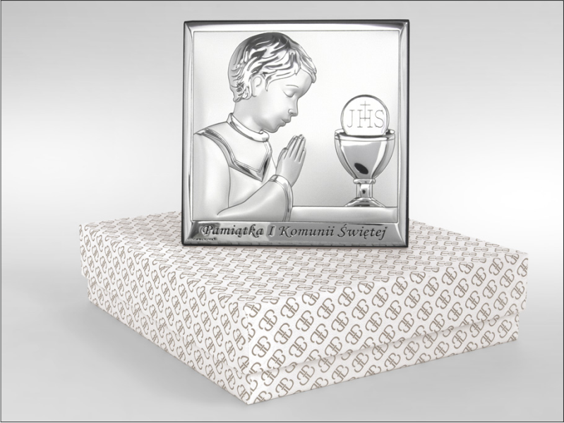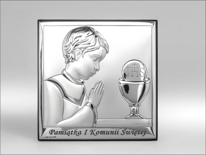 Srebrny Obrazek "Pamiątka I Komunii Św. dla chłopczyka z podpisem kwadratowy 6568O".