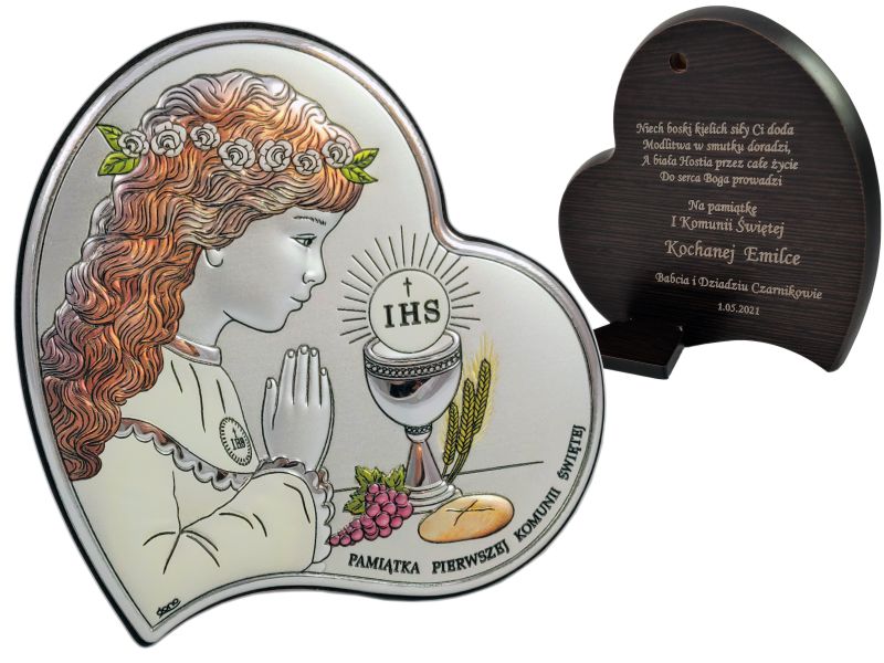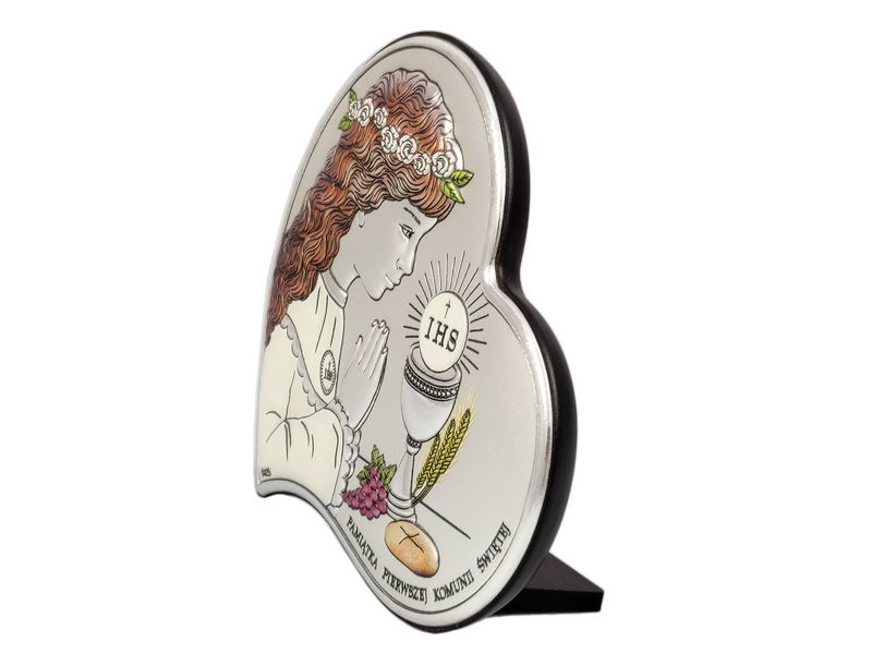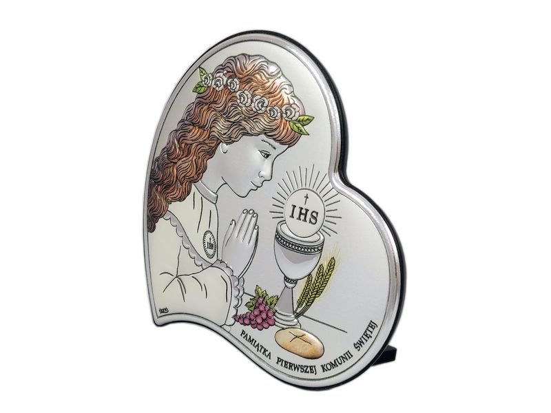 Srebrny obrazek DS03/CA w wersji z malowaniem ma kształt serca i przedstawia dziewczynkę, kielich i hostię.