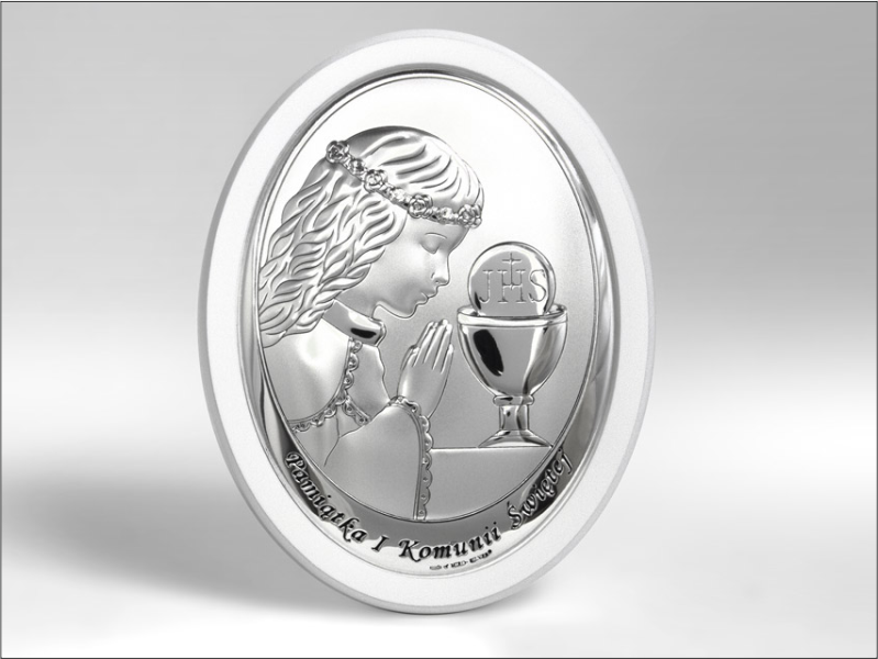 - obrazek srebrny przedstawiający wizerunek dziewczynki z Hostią i kielichem