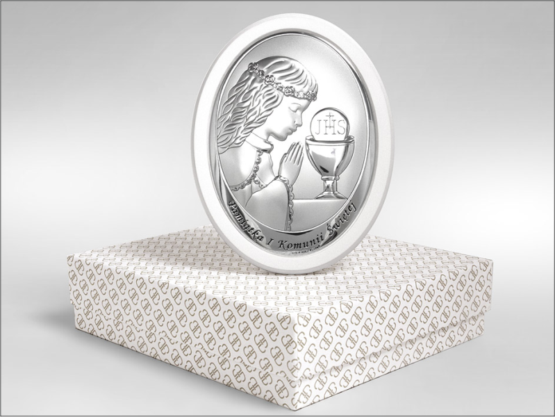 Srebrny Obrazek "Pamiątka I Komunii Św. dla dziewczynki owalny na drewnie z podpisem 6571AW".