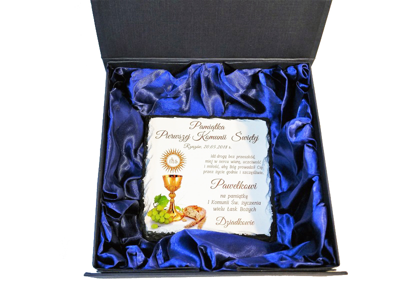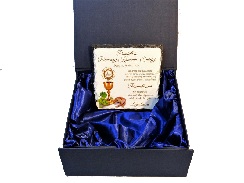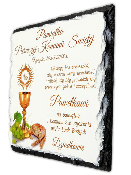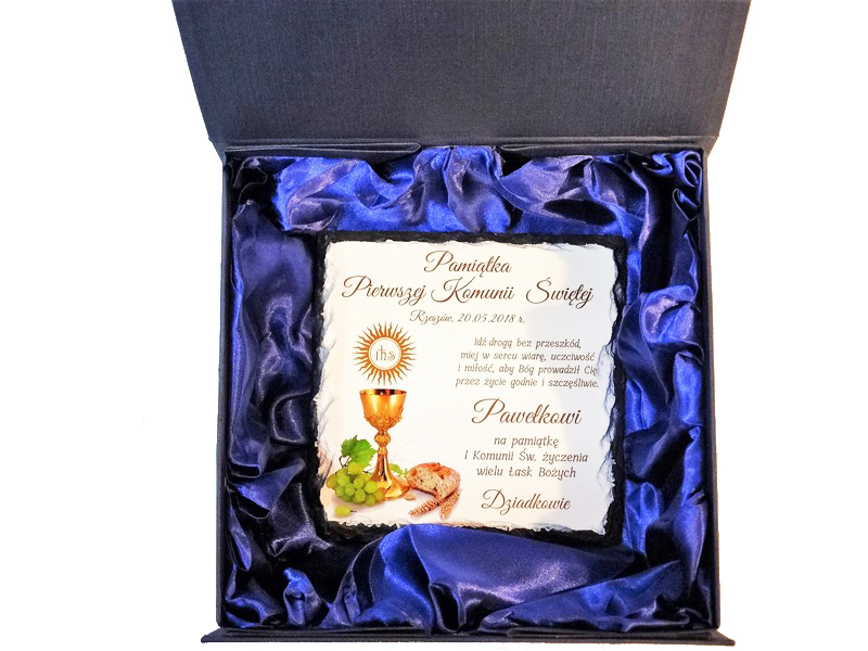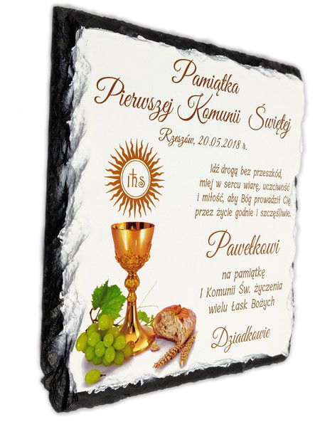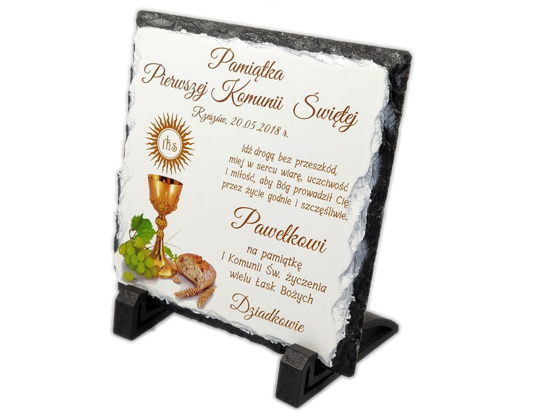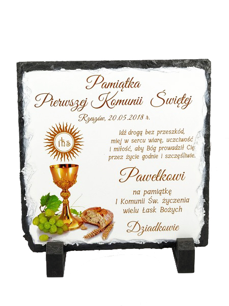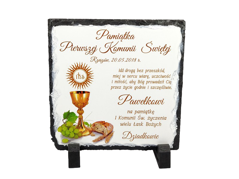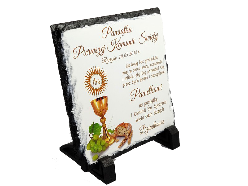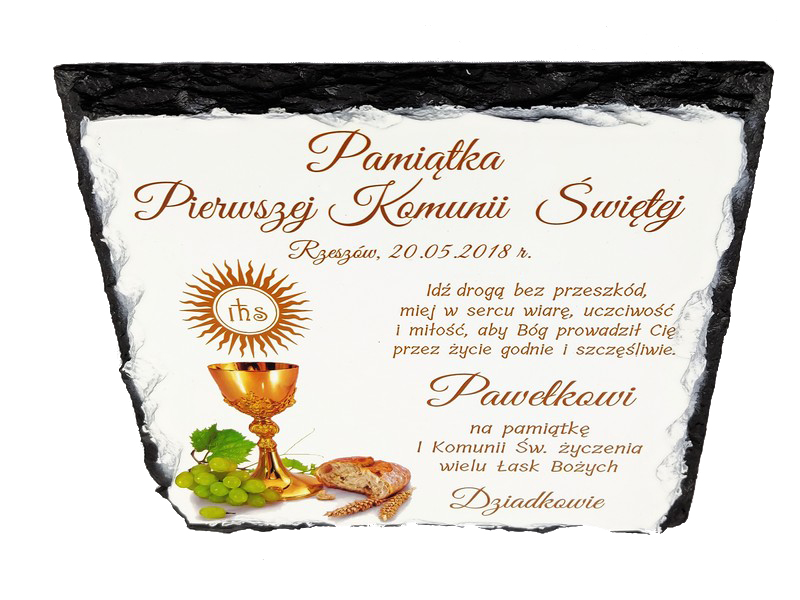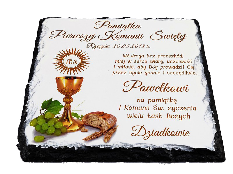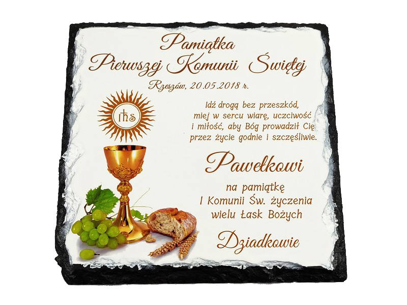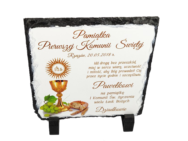 Pamiątka Pierwszej Komunii Świętej w formie płaskiego kamienia - fotogranitu - z nadrukiem dedykacji i ozdobnych grafik.