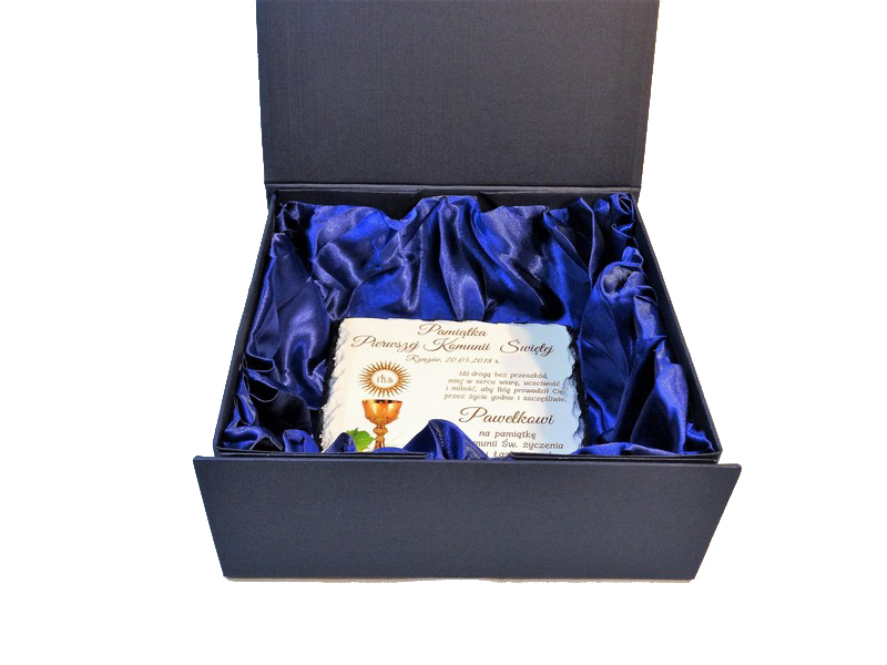 Do kamienia można dodatkowo zamówić kartonowe, wyściełane materiałem, niebieskie, składane etui.