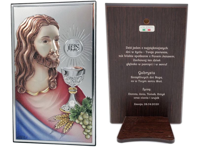 Prezent na pamiątkę I Komunii Świętej w postaci kolorowego srebrnego obrazka z Jezusem, Hostią i kielichem z grawerem.
