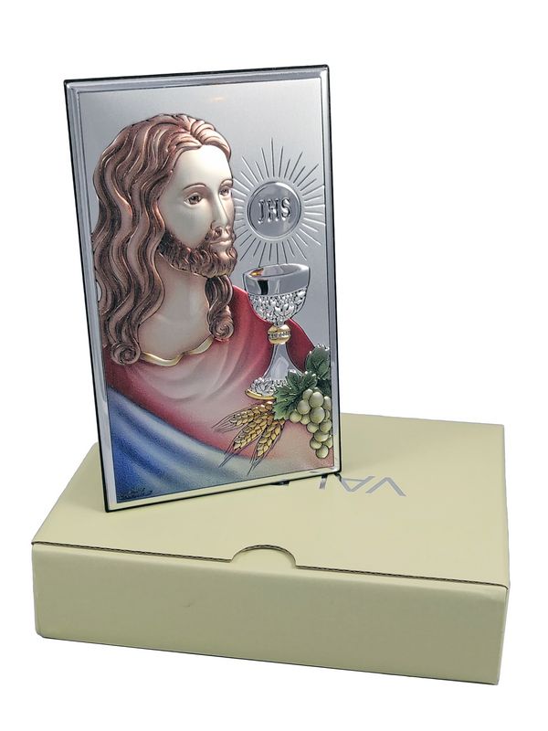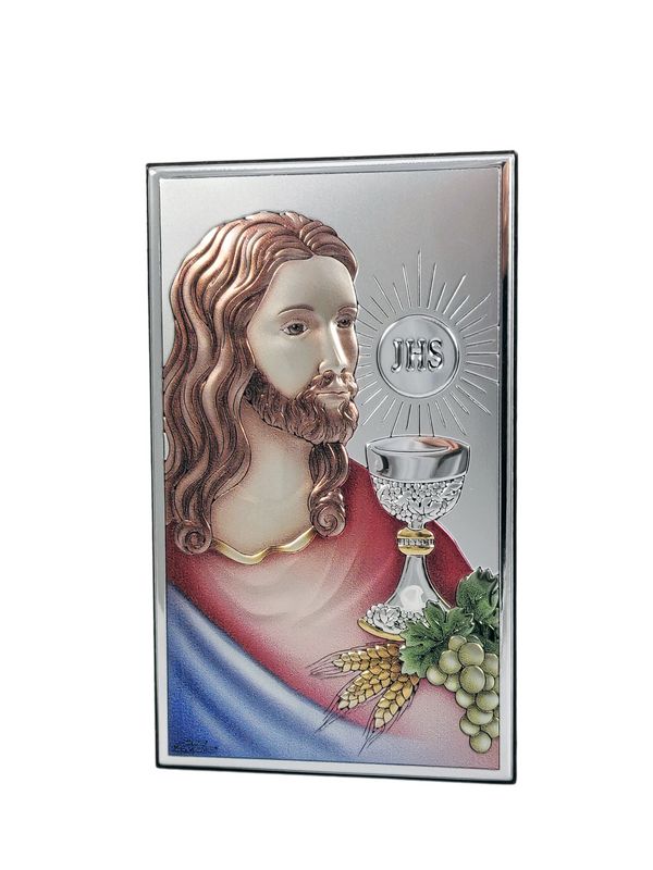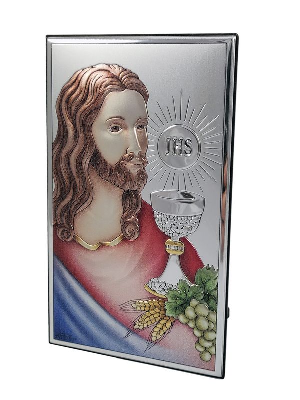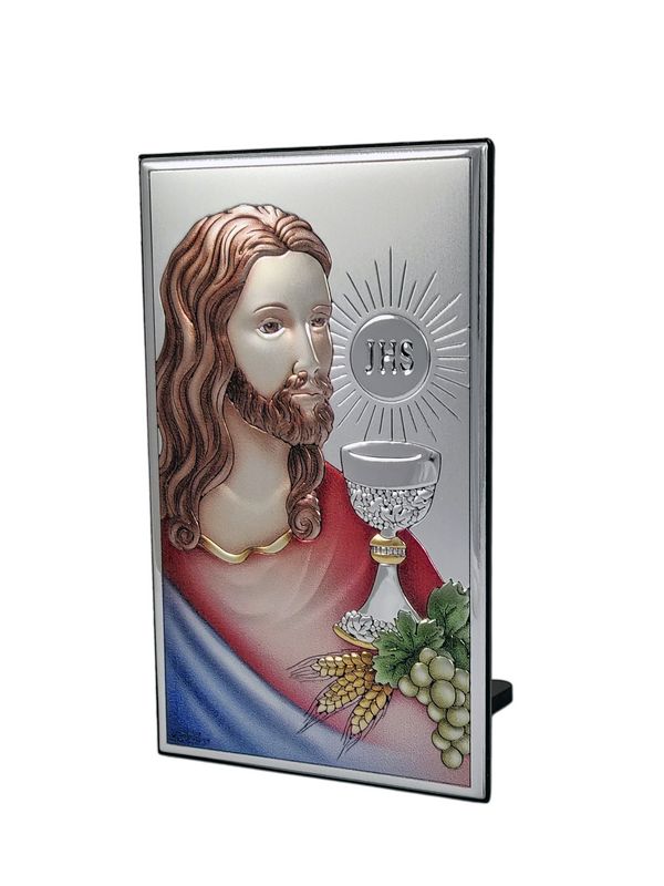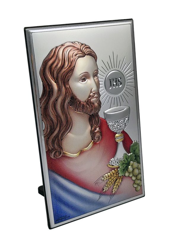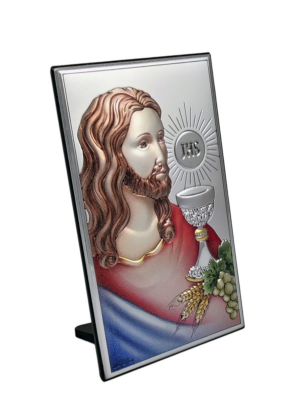 - kolorowy srebrny obrazek przedstawiający Jezusa z Hostią i kielichem