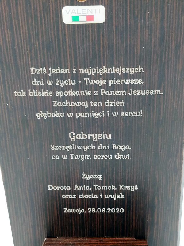 Na odwrocie obrazka wygrawerowana jest pamiątkowa dedykacja z okazji przyjęcia I Komunii Św.