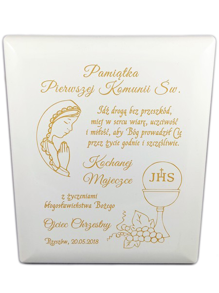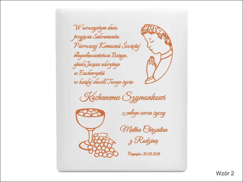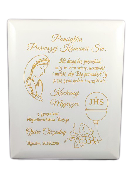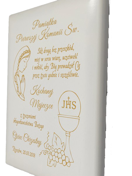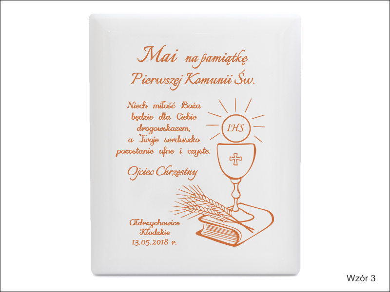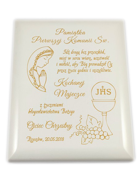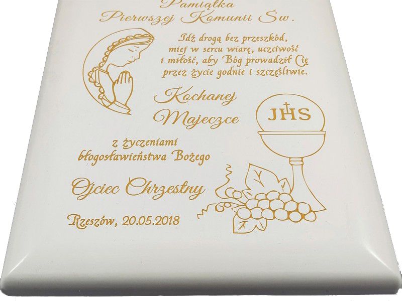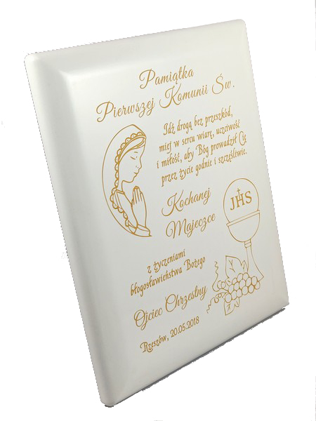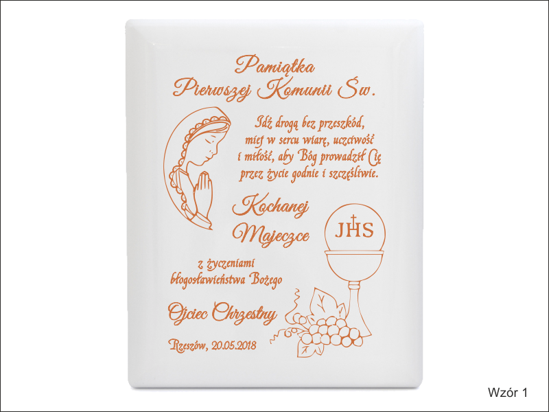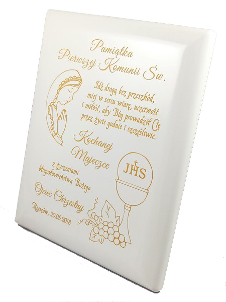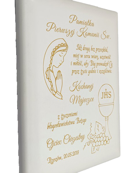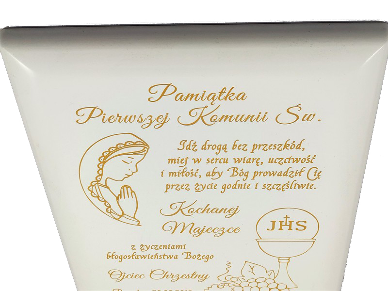 Dedykacja oraz ozdobne grafiki z motywem komunijnym są wygrawerowane bezpośrednio na podkładzie w pionowym układzie.
